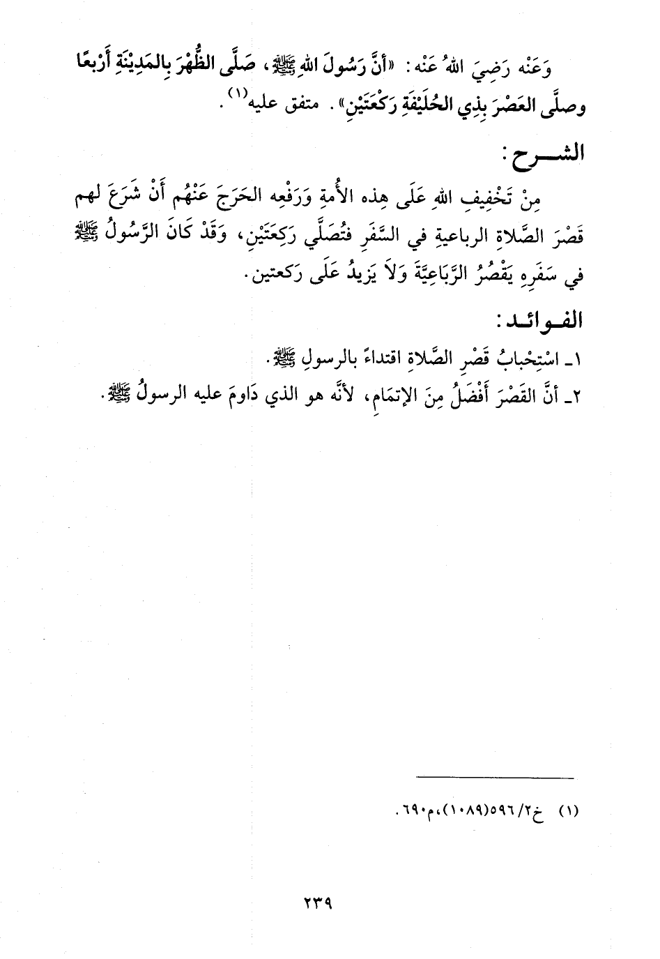 وعنه رضي الله عنه: "أن رسول الله صلى الله عليه وسلم، صلى الظهر بالمدينة أربعاً وصلى العصر بذي الحليفة ركعتين". (¬1).