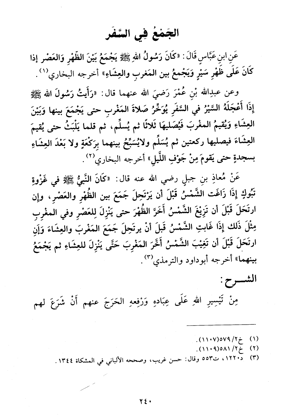 عن معاذ بن جبل رضي الله عنه قال: "كان النبي صلى الله عليه وسلم في غزوة تبوك إذا زاغت الشمس قبل أن يرتحل جمع بين الظهر والعصر، وإن ارتحل قبل أن تزيغ الشمس أخر الظهر حتى ينزل للعصر وفي المغرب مثل ذلك إذا غابت الشمس قبل أن يرتحل جمع المغرب والعشاء وإن ارتحل قبل أن تغيب الشمس أخر المغرب حتى ينزل للعشاء ثم يجمع بينهما" أخرجه أبو داود والترمذي (¬3).
