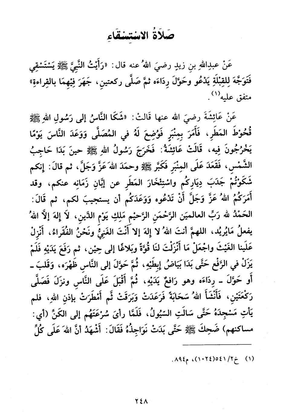 عن عبد الله بن زيد رضي الله عنه قال: "رأيت النبي صلى الله عليه وسلم يستسقي فتوجه للقبلة يدعو وحول رداءه ثم صلى ركعتين، جهر فيهما بالقراءة" متفق عليه (¬1).