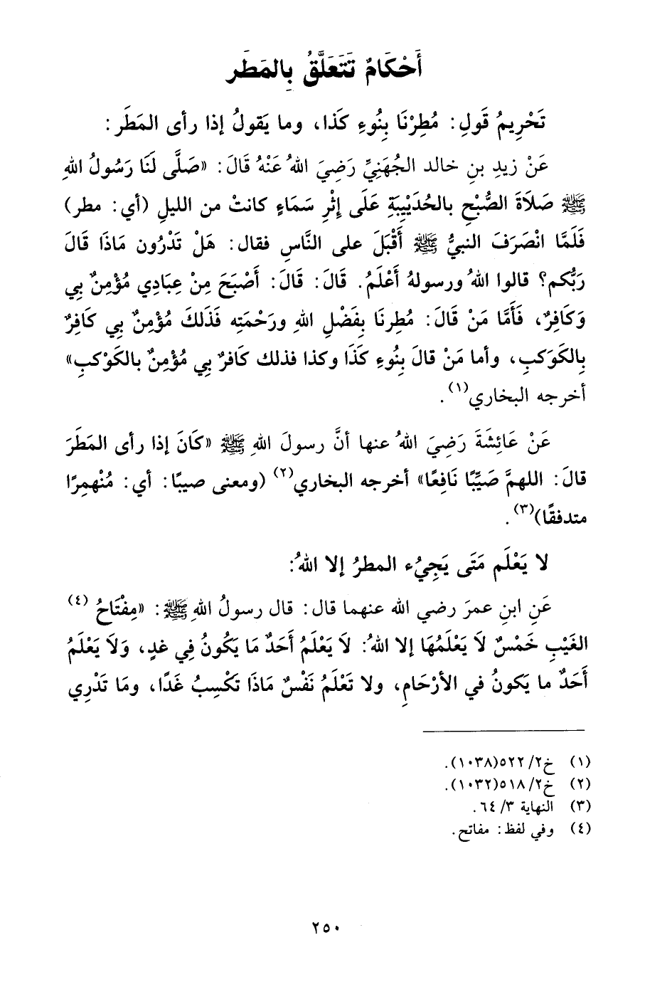 عن زيد بن خالد الجهني رضي الله عنه قال: "صلى لنا رسول الله صلى الله عليه وسلم صلاة الصبح بالحديبية على إثر سماء كانت من الليل (أي: مطر) فلما انصرف النبي صلى الله عليه وسلم أقبل على الناس فقال: هل تدرون ماذا قال ربكم؟ قالوا الله ورسوله أعلم. قال: قال: أصبح من عبادي مؤمن بي وكافر، فأما من قال: مطرنا بفضل الله ورحمته فذلك مؤمن بي كافر بالكوكب، وأما من قال بنوء كذا وكذا فذلك كافر بي مؤمن بالكوكب" أخرجه البخاري (¬1).