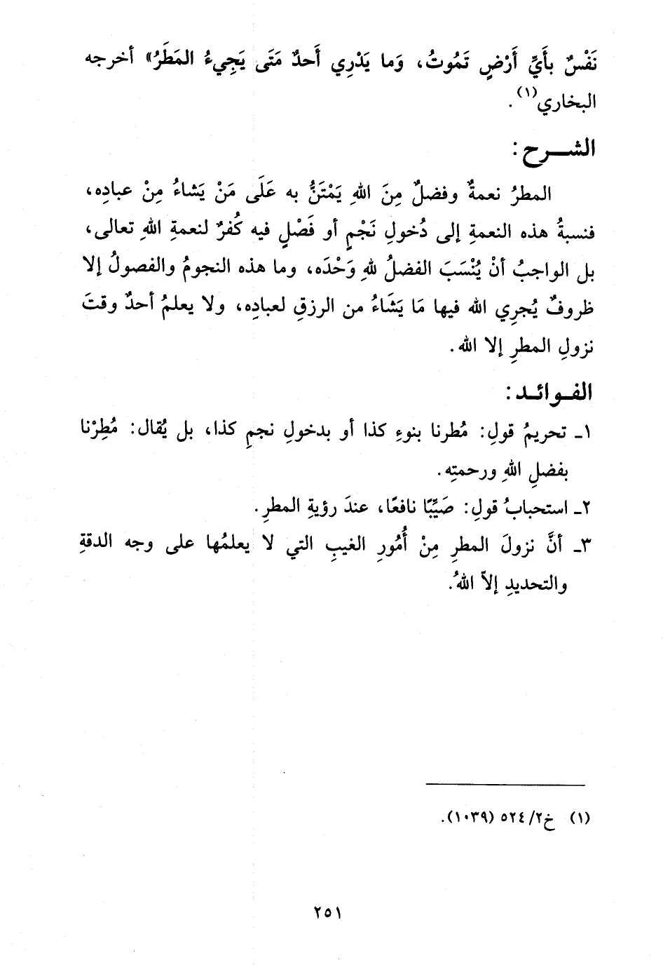 - تحريم قول: مطرنا بنوء كذا أو بدخول نجم كذا، بل يقال: مطرنا بفضل الله ورحمته.