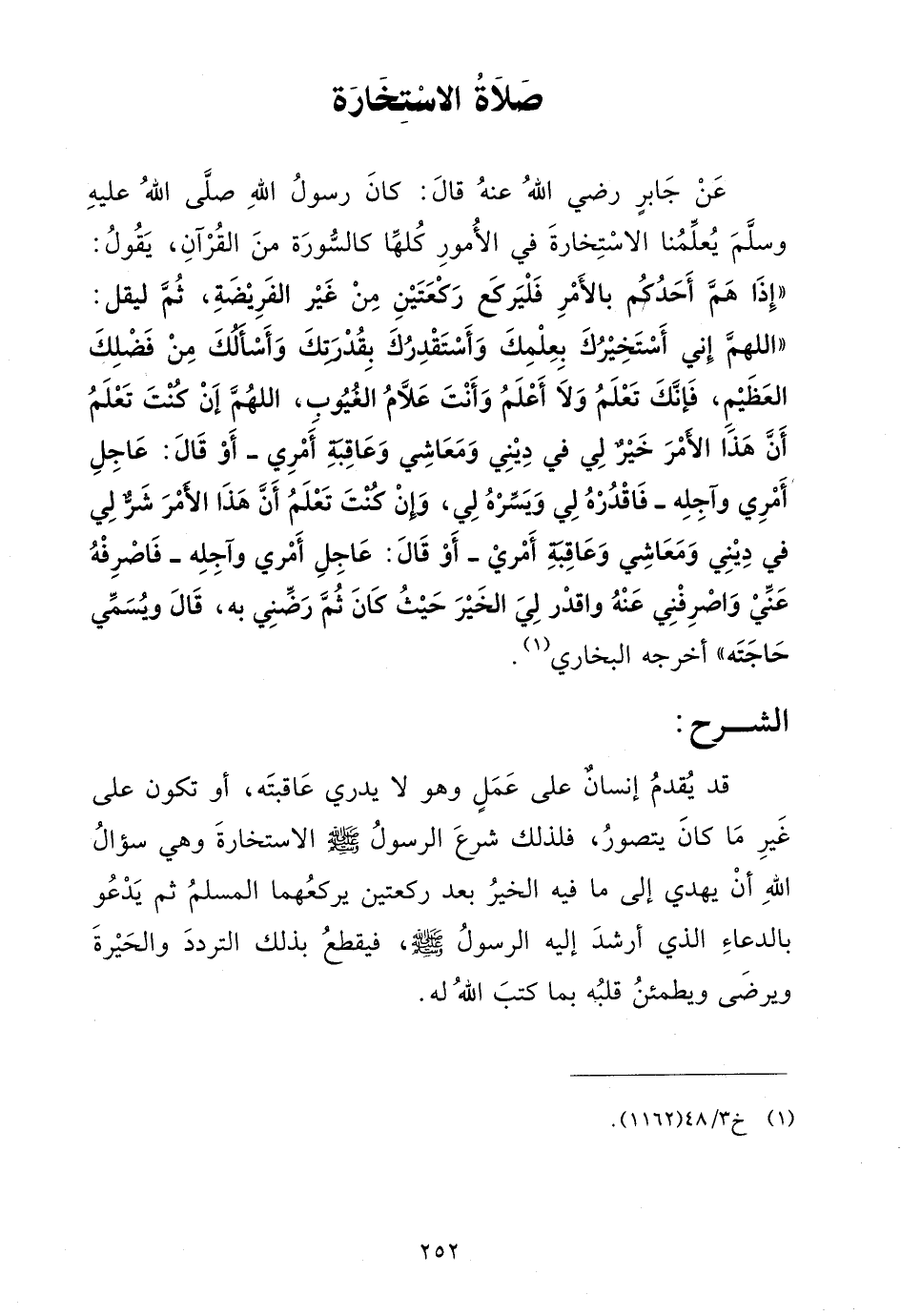 عن جابر رضي الله عنه قال: كان رسول الله صلى الله عليه وسلم يعلمنا الاستخارة في الأمور كلها كالسورة من القرآن، يقول: "إذا هم أحدكم بالأمر فليركع ركعتين من غير الفريضة، ثم ليقل: "اللهم إني أستجيرك بعلمك وأستقدرك بقدرتك وأسألك من فضلك العظيم، فإنك تعلم ولا أعلم وأنت علام الغيوب، اللهم إن كنت تعلم أن هذا الأمر خير لي في ديني ومعاشي وعاقبة أمري - أو قال: عاجل أمري وآجله - فاقدره لي ويسره لي، وإن كنت تعلم أن هذا الأمر شر لي في ديني ومعاشي وعاقبة أمري - أو قال: عاجل أمري وآجله - فاصرفه عني واصرفني عنه واقدر لي الخير حيث كان ثم رضني به، قال ويسمي حاجته" أخرجه البخاري (¬1).