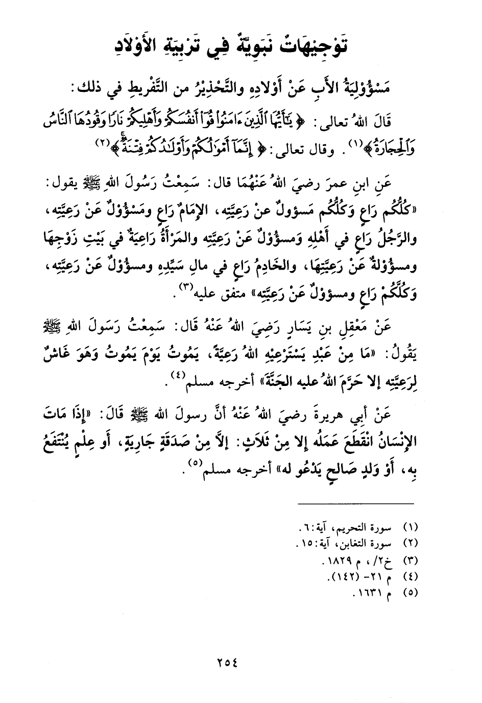 قال الله تعالى: {يَا أَيُّهَا الَّذِينَ آمَنُوا قُوا أَنفُسَكُمْ وَأَهْلِيكُمْ نَارًا وَقُودُهَا النَّاسُ وَالْحِجَارَةُ} (¬1). وقال تعالى {إِنَّمَا أَمْوَالُكُمْ وَأَوْلادُكُمْ فِتْنَةٌ} (¬2).