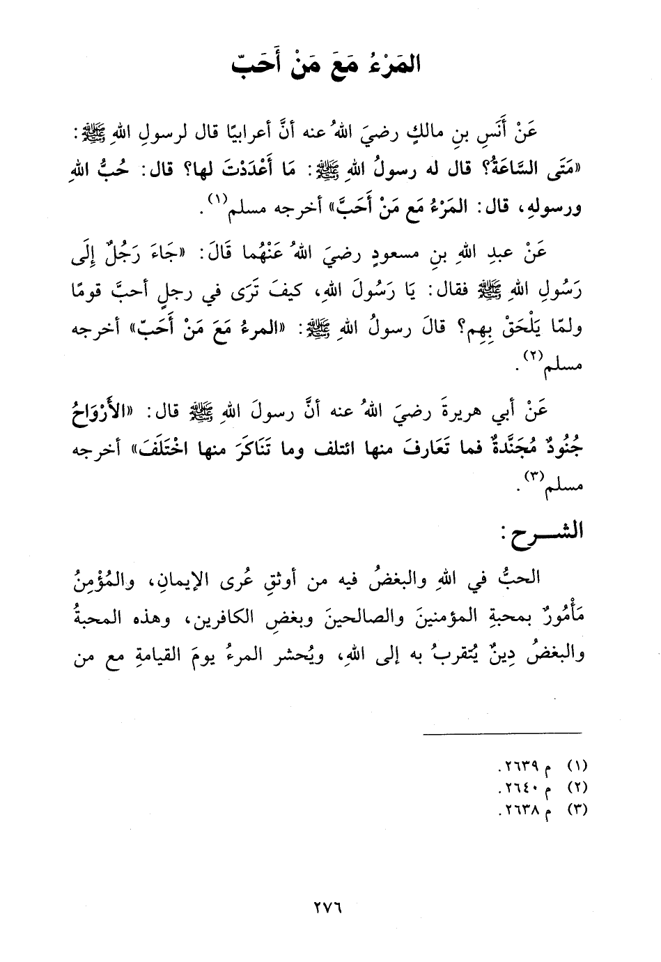 عن أنس بن مالك رضي الله عنه أن أعرابياً قال لرسول الله صلى الله عليه وسلم: "متى الساعة؟ قال له رسول الله صلى الله عليه وسلم: "ما أعددت لها؟ قال: حب الله ورسوله، قال: المرء مع من أحب" أخرجه مسلم (¬1).