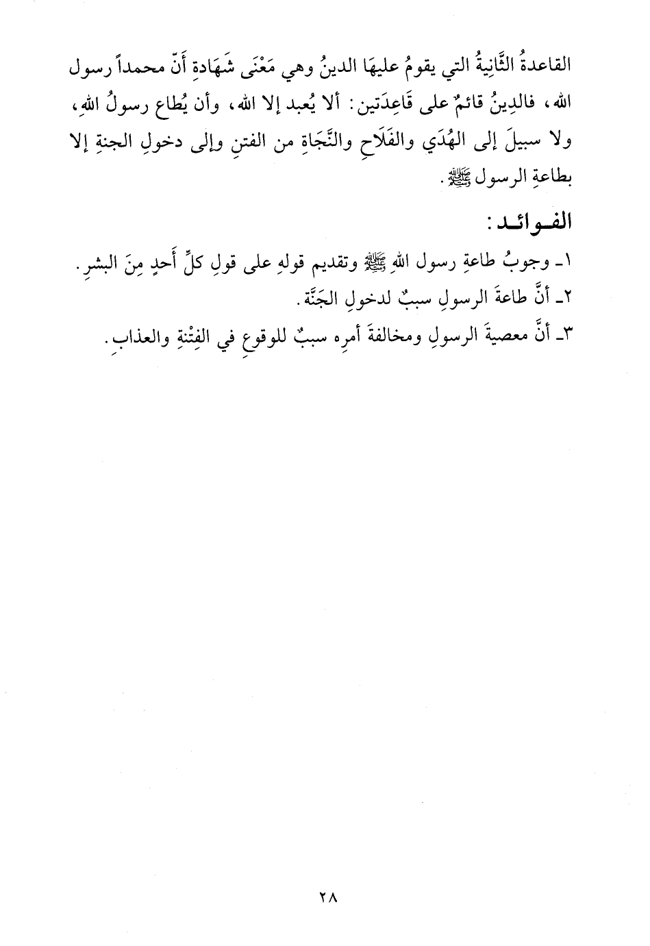 القاعدة الثانية التي يقوم عليها الدين وهي معنى شهادة أن محمداً رسول الله، فالدين قائم على قاعدتين: ألا يعبد إلا الله، وأن يطاع رسول الله، ولا سبيل إلى الهدى والفلاح والنجاة من الفتن وإلى دخول الجنة إلا بطاعة الرسول صلى الله عليه وسلم.