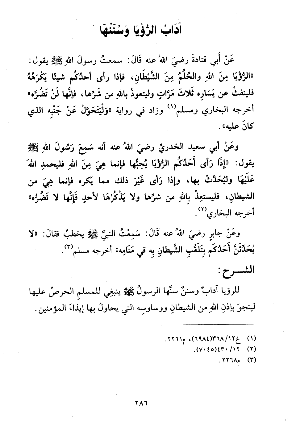 عن أبي قتادة رضي الله عنه قال: سمعت رسول الله صلى الله عليه وسلم يقول: "الرؤيا من الله والحلم من الشيطان، فإذا رأى أحدكم شيئاً يكرهه فلينفث عن يساره ثلاث مرات وليتعوذ بالله من شرها، فإنها لن تضره" أخرجه البخاري ومسلم (¬1) وزاد في رواية "وليتحول عن جنبه الذي كان عليه".