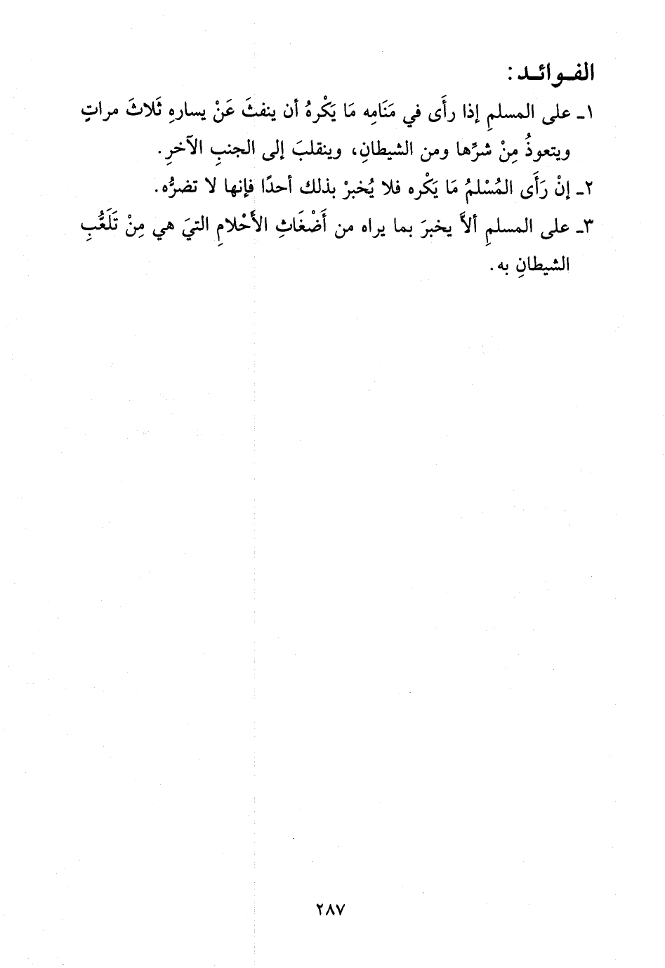 - على المسلم إذا رأى في منامه ما يكره أن ينفث عن يساره ثلاث مرات ويتعوذ من شرها ومن الشيطان، وينقلب إلى الجنب الآخر.