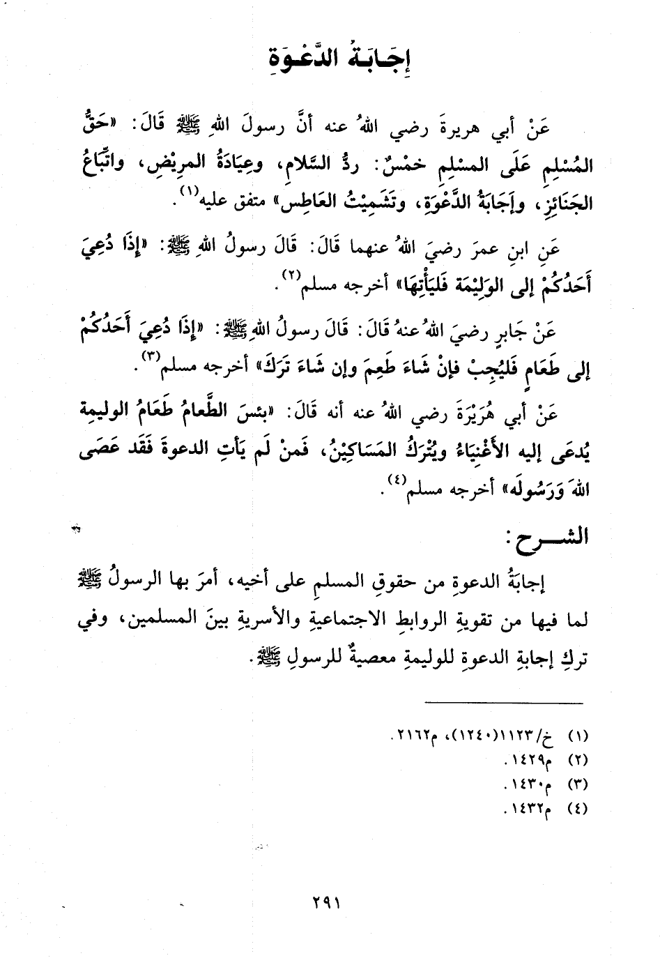 عن أبي هريرة رضي الله عنه أنه قال: "بئس الطعام طعام الوليمة يدعى إليه الأغنياء ويترك المساكين، فمن لم يأت الدعوة فقد عصى الله ورسوله" أخرجه مسلم (¬4).