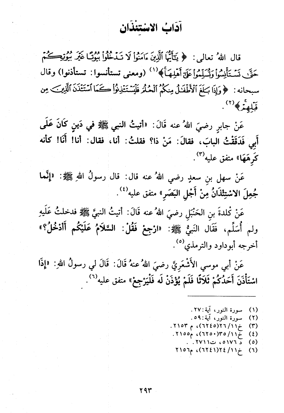 قال الله تعالى: {يَا أَيُّهَا الَّذِينَ آمَنُوا لا تَدْخُلُوا بُيُوتًا غَيْرَ بُيُوتِكُمْ حَتَّى تَسْتَانِسُوا وَتُسَلِّمُوا عَلَى أَهْلِهَا} (¬1) (ومعنى تستأنسوا: تستأذنوا) وقال سبحانه: {وَإِذَا بَلَغَ الأَطْفَالُ مِنكُمُ الْحُلُمَ فَلْيَسْتَاذِنُوا كَمَا اسْتَاذَنَ الَّذِينَ مِن قَبْلِهِمْ} (¬2).