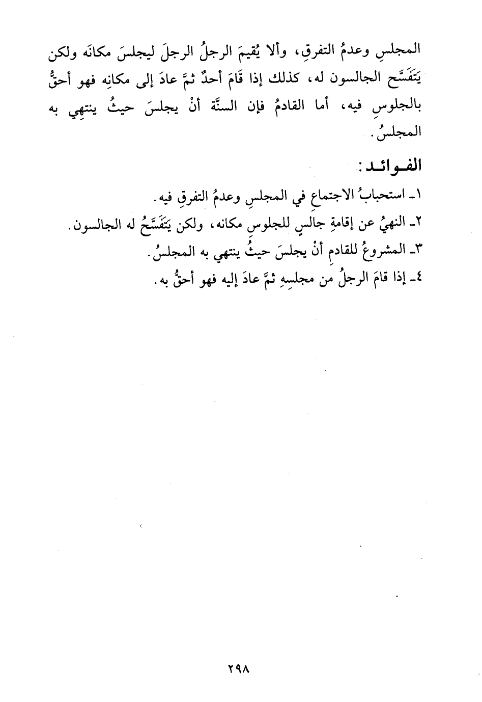 المجلس وعدم التفرق، وألا يقيم الرجل الرجل ليجلس مكانه ولكن يتفسح الجالسون له، كذلك إذا قام أحد ثم عاد إلى مكانه فهو أحق بالجلوس فيه، أما القادم فإن السنة أن يجلس حيث ينتهي به المجلس.