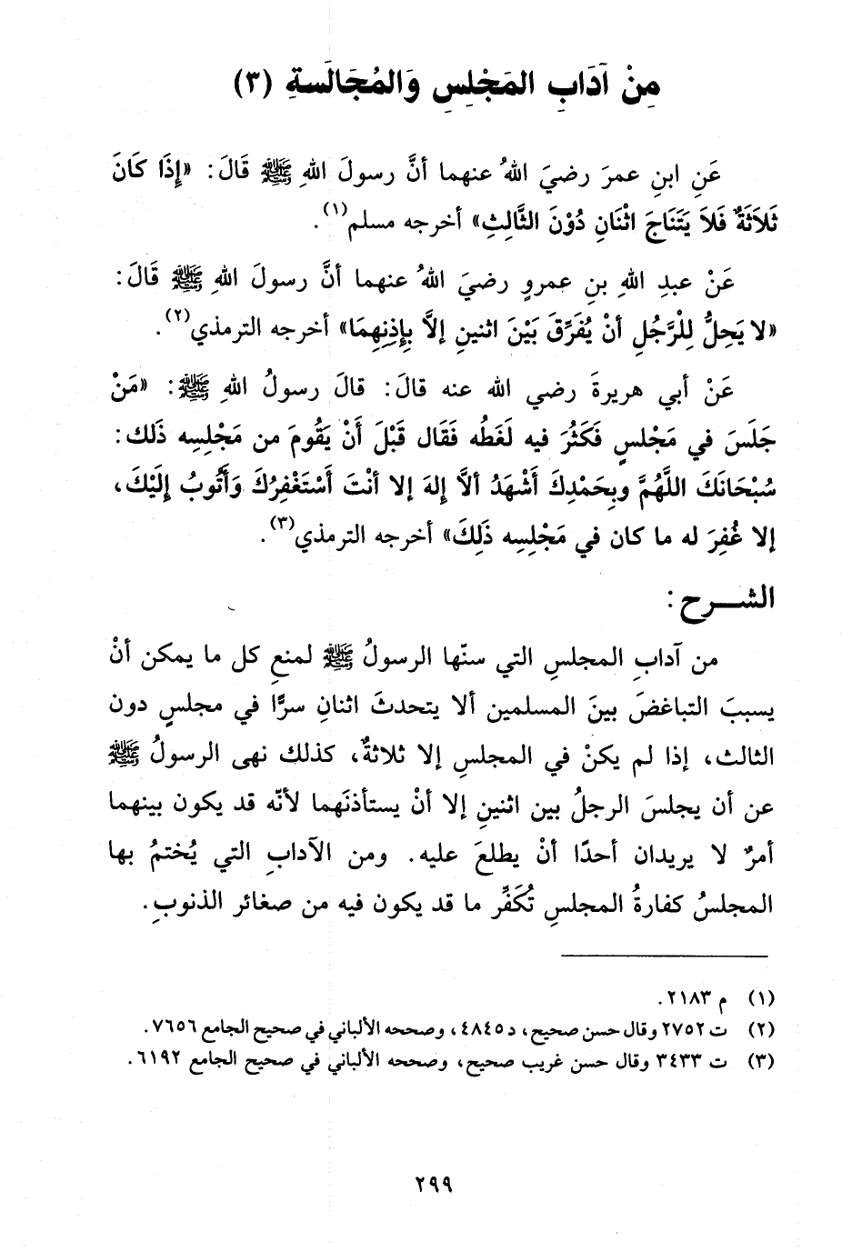 عن ابن عمر رضي الله عنهما أن رسول الله صلى الله عليه وسلم قال: "إذا كان ثلاثة فلا يتناج اثنان دون الثالث" أخرجه مسلم (¬1).