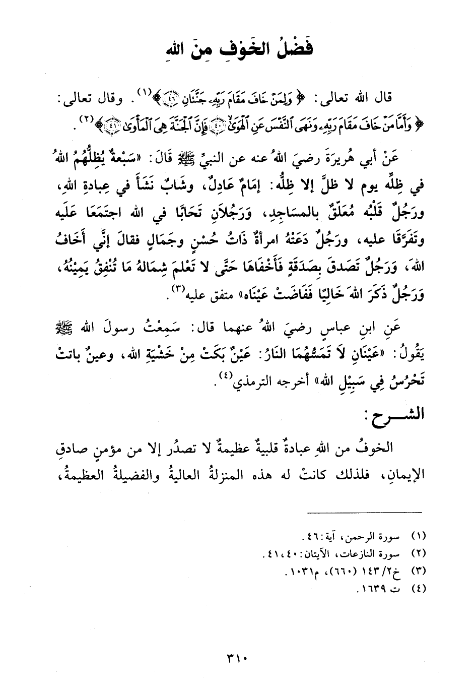 عن أبي هريرة رضي الله عنه عن النبي صلى الله عليه وسلم قال: "سبعة يظلهم الله في ظله يوم لا ظل إلا ظله: إمام عادل، وشاب نشأ في عبادة الله، ورجل قلبه معلق بالمساجد، ورجلان تحابا في الله اجتمعا عليه وتفرقا عليه، ورجل دعته امرأة ذات حسن وجمال فقال إني أخاف الله، ورجل تصدق بصدقة فأخفاها حتى لا تعلم شماله ما تنفق يمينه، ورجل ذكر الله خالياً ففاضت عيناه" متفق عليه (¬3).