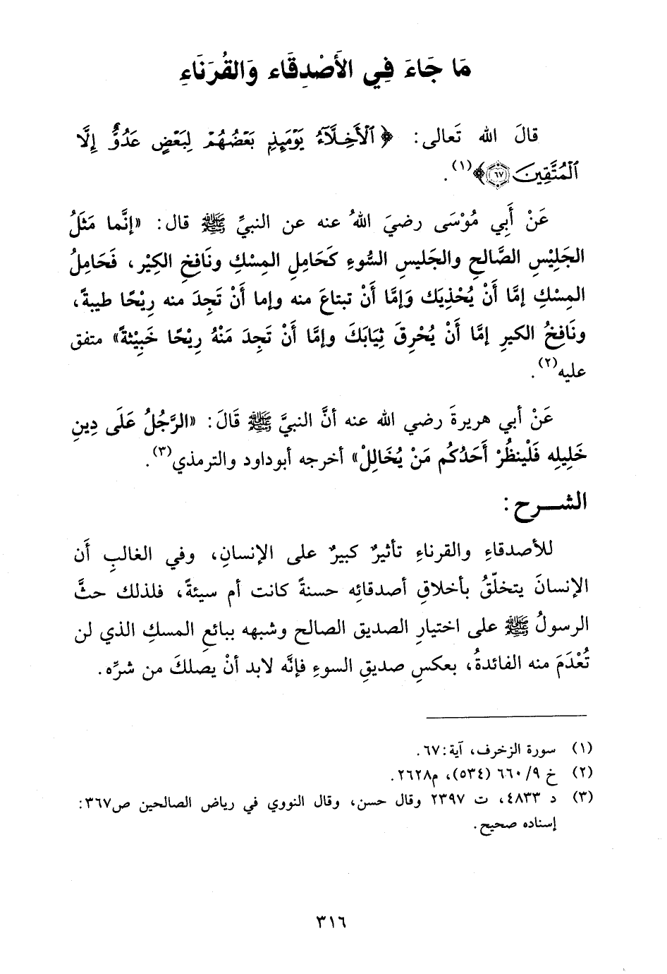 للأصدقاء والقرناء تأثير كبير على الإنسان، وفي الغالب أن الإنسان يتخلق بأخلاق أصدقائه حسنة كانت أم سيئة، فلذلك حث الرسول صلى الله عليه وسلم على اختيار الصديق الصالح وشبهه ببائع المسك الذي لن تعدم منه الفائدة، بعكس صديق السوء فإنه لابد أن يصلك من شره.