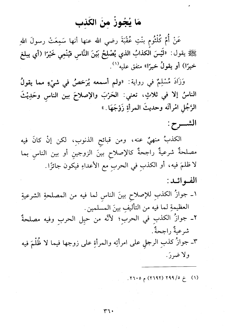 وزاد مسلم في رواية: "ولم أسمعه يرخص في شيء مما يقول الناس إلا في ثلاث، تعني: الحرب والإصلاح بين الناس وحديث الرجل امرأته وحديث المرأة زوجها. "