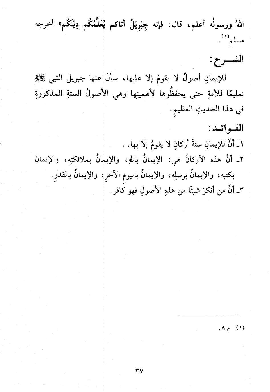 - أن هذه الأركان هي: الإيمان بالله، والإيمان بملائكته، والإيمان بكتبه، والإيمان برسله، والإيمان باليوم الآخر، والإيمان بالقدر.