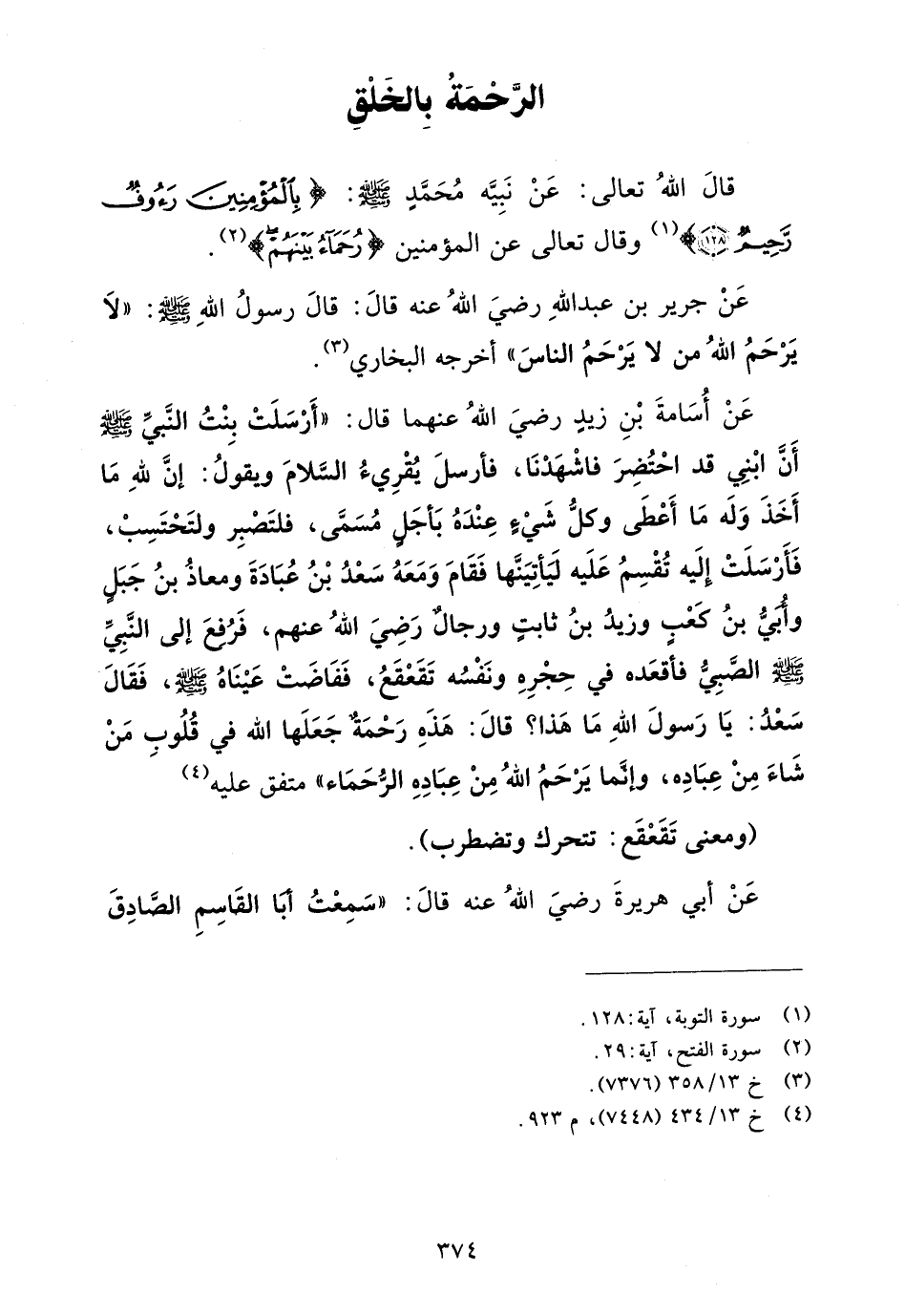 قال الله تعالى: عن نبيه محمد صلى الله عليه وسلم: {بِالْمُؤْمِنِينَ رَؤُوفٌ رَّحِيمٌ} (¬1) وقال تعالى عن المؤمنين {رُحَمَاء بَيْنَهُمْ} (¬2).