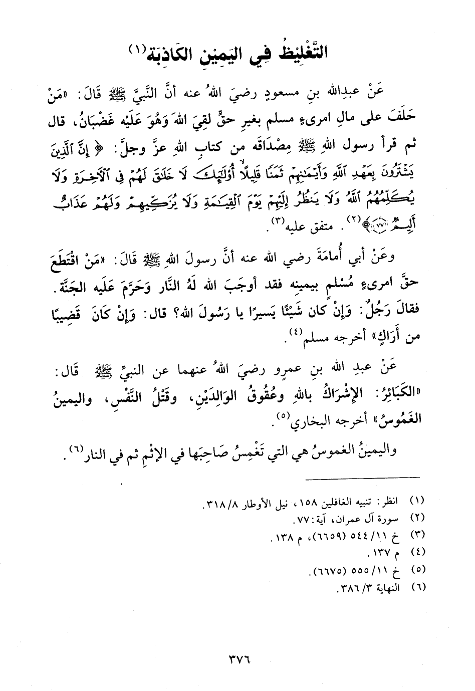 عن عبد الله بن مسعود رضي الله عنه أن النبي صلى الله عليه وسلم قال: "من حلف على مال امرئ مسلم بغير حق لقي الله وهو عليه غضبان، قال ثم قرأ رسول الله صلى الله عليه وسلم مصداقه من كتاب الله عز وجل: {إِنَّ الَّذِينَ يَشْتَرُونَ بِعَهْدِ اللهِ وَأَيْمَانِهِمْ ثَمَنًا قَلِيلاً أُوْلَئِكَ لاَ خَلاَقَ لَهُمْ فِي الآخِرَةِ وَلاَ يُكَلِّمُهُمُ اللهُ وَلاَ يَنظُرُ إِلَيْهِمْ يَوْمَ الْقِيَامَةِ وَلاَ يُزَكِّيهِمْ وَلَهُمْ عَذَابٌ أَلِيمٌ} (¬2). متفق عليه (¬3).