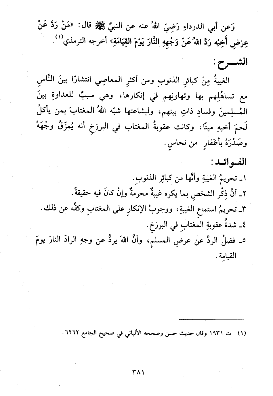 - فضل الرد عن عرض المسلم، وأن الله يرد عن وجه الراد النار يوم القيامة.