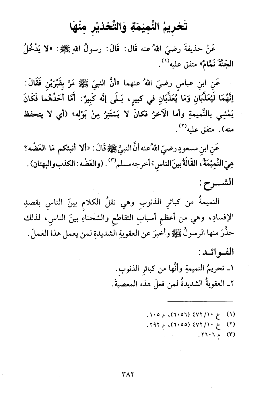 عن حذيفة رضي الله عنه قال: قال: رسول الله صلى الله عليه وسلم: "لا يدخل الجنة نمام"متفق عليه (¬1).