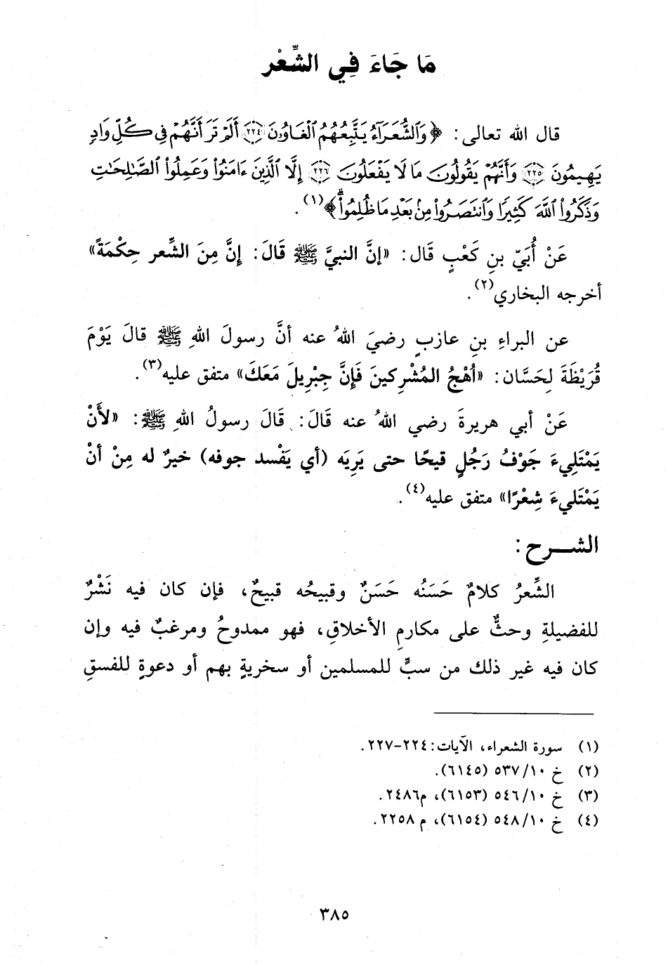 قال الله تعالى: {وَالشُّعَرَاء يَتَّبِعُهُمُ الْغَاوُونَ} أَلَمْ تَرَ أَنَّهُمْ فِي كُلِّ وَادٍ يَهِيمُونَ} وَأَنَّهُمْ يَقُولُونَ مَا لا يَفْعَلُونَ} إِلاَّ الَّذِينَ آمَنُوا وَعَمِلُوا الصَّالِحَاتِ وَذَكَرُوا اللَّهَ كَثِيرًا وَانتَصَرُوا مِن بَعْدِ مَا ظُلِمُوا} (¬1).