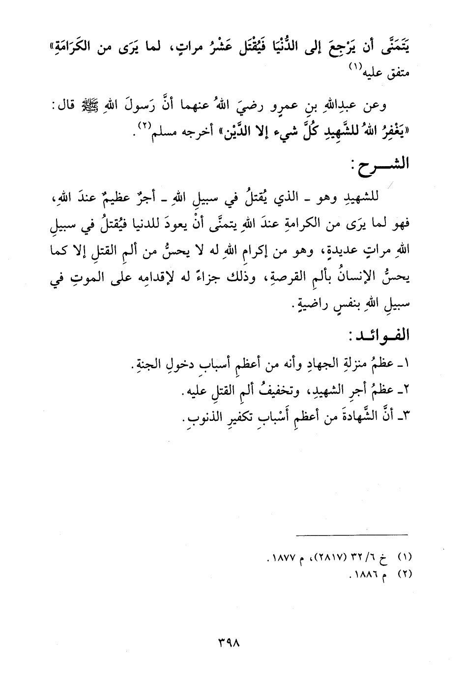 للشهيد وهو- الذي يقتل في سبيل الله-أجر عظيم عند الله، فهو لما يرى من الكرامة عند الله يتمنى أن يعود للدنيا فيقتل في سبيل الله مرات عديدة، وهو من إكرام الله له لا يحس من ألم القتل إلا كما يحس الإنسان بألم القرصة، وذلك جزاء له لإقدامه على الموت في سبيل الله بنفس راضية.