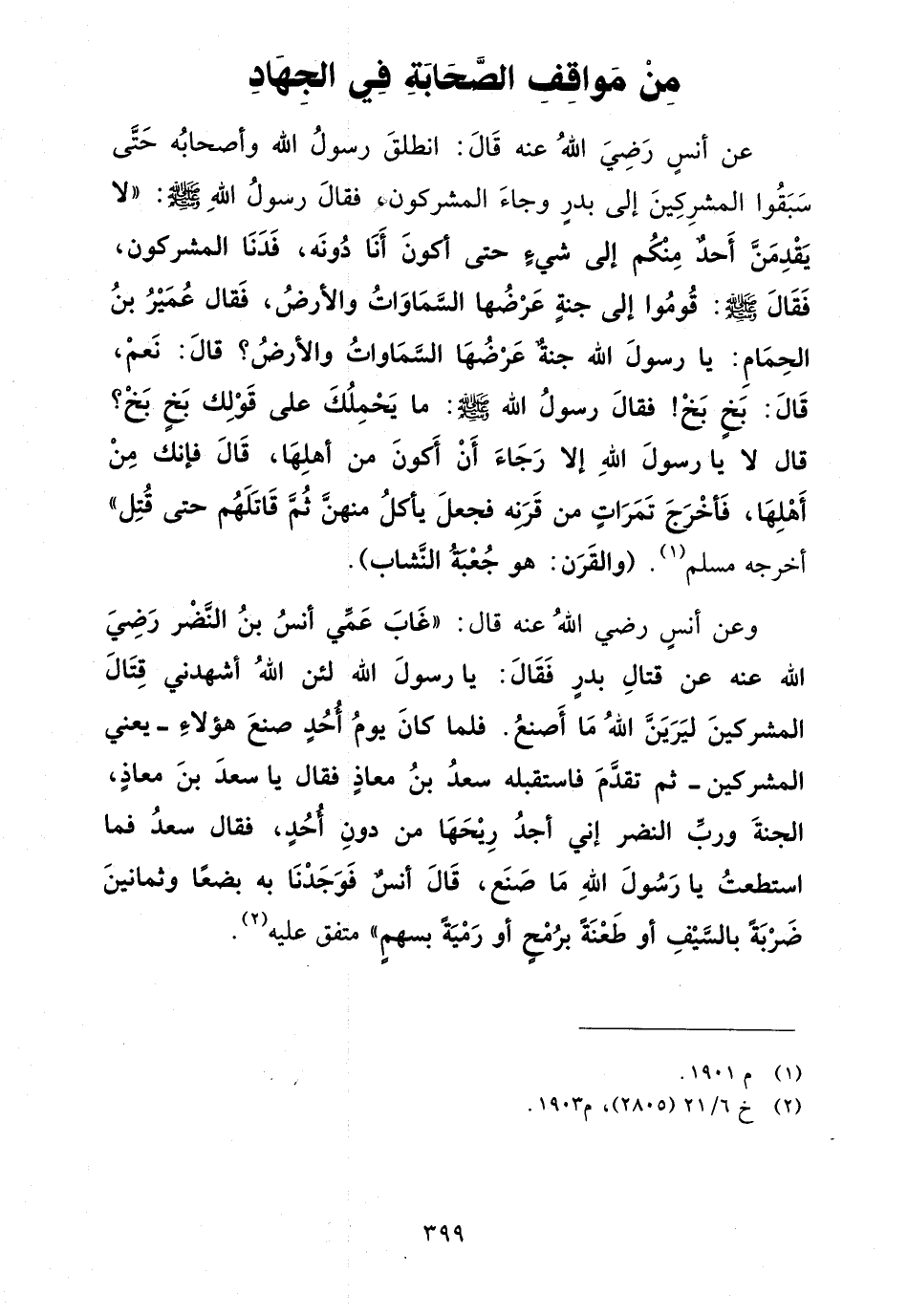 عن أنس رضي الله عنه قال: انطلق رسول الله وأصحابه حتى سبقوا المشركين إلى بدر وجاء المشركون، فقال رسول الله صلى الله عليه وسلم: "لا يقدمن أحد منكم إلى شيء حتى أكون أنا دونه، فدنا المشركون، فقال صلى الله عليه وسلم: قوموا إلى جنة عرضها السماوات والأرض؟، فقال عمير بن الحمام: يا رسول الله جنة عرضها السماوات والأرض؟ قال: نعم، قال: بخ بخ! فقال رسول الله صلى الله عليه وسلم: ما يحملك على قولك بخ بخ؟ قال لا يا رسول الله إلا رجاء أن أكون من أهلها، قال فإنك من أهلها، فأخرج تمرات من قرنه فجعل يأكل منهن ثم قاتلهم حتى قتل"أخرجه مسلم (¬1). (والقرن: هو جعبة النشاب).