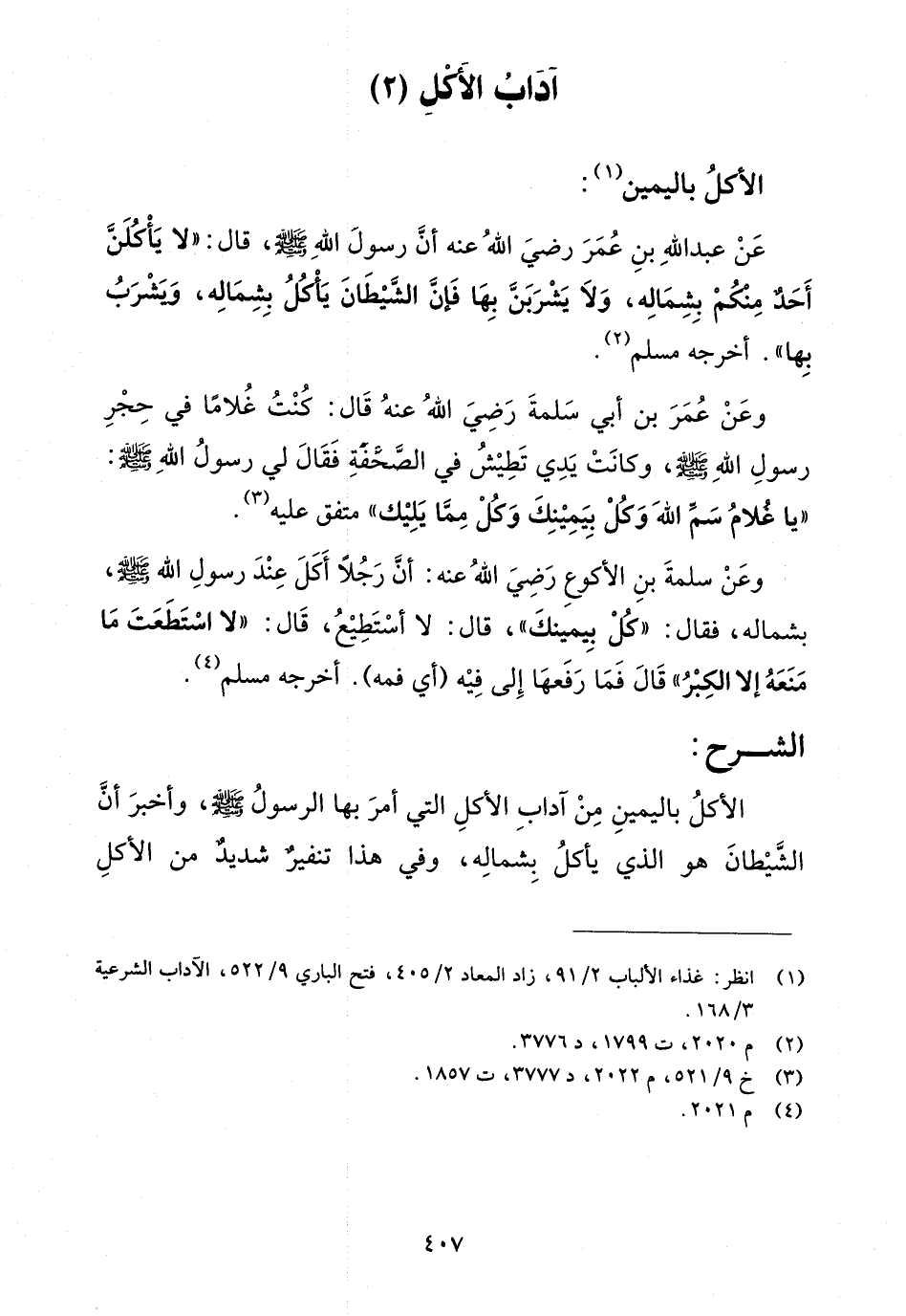 عن عبد الله بن عمر رضي الله عنه أن رسول الله صلى الله عليه وسلم، قال: "لا يأكلن أحد منكم بشماله، ولا يشربن بها فإن الشيطان يأكل بشماله، ويشرب بها". أخرجه مسلم (¬2).