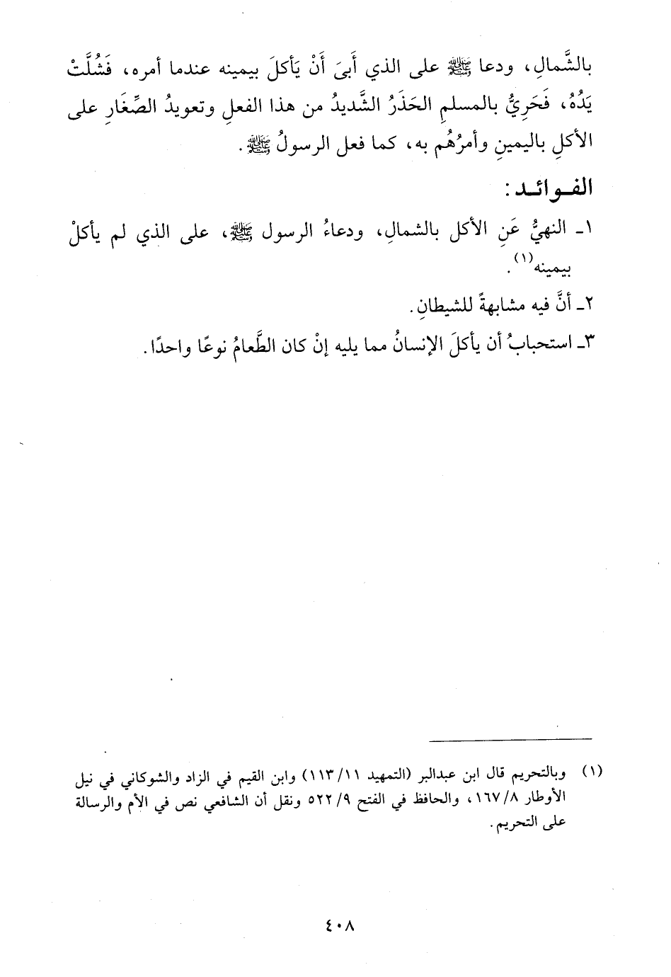 - النهي عن الأكل بالشمال، ودعاء الرسول رسول الله صلى الله عليه وسلم، على الذي لم يأكل بيمينه (¬1).