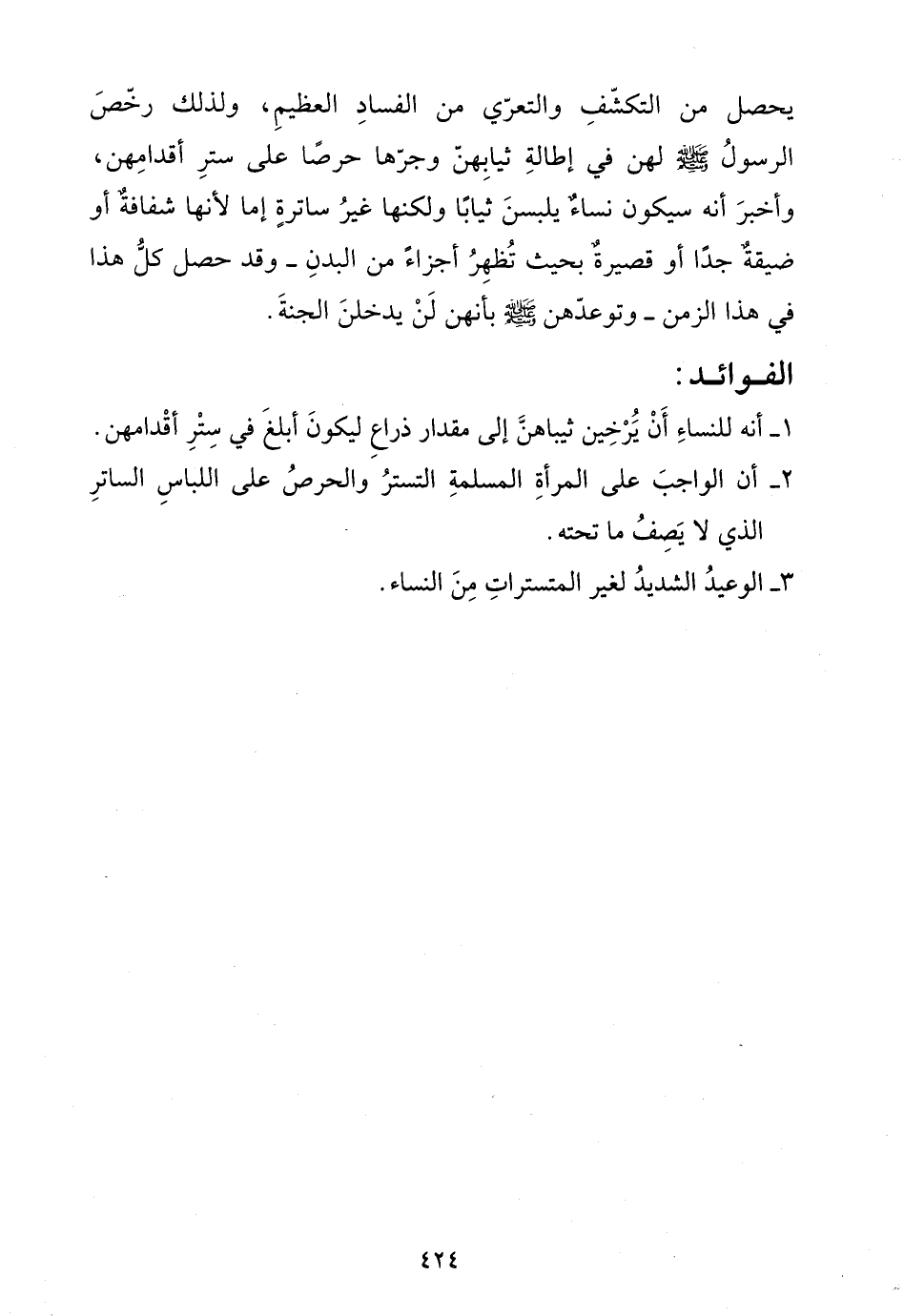 يحصل من التكشف والتعري من الفساد العظيم، ولذلك رخص الرسول صلى الله عليه وسلم لهن في إطالة ثيابهن وجرها حرصاً على ستر أقدامهن، وأخبر أنه سيكون نساء يلبسن ثياباً ولكنها غير ساترةٍ إما لأنها شفافة أو ضيقة جداً أو قصيرة بحيث تظهر أجزاء من البدن- وقد حصل كل هذا في هذا الزمن- وتوعدهن رسول الله صلى الله عليه وسلم بأنهن لن يدخلن الجنة