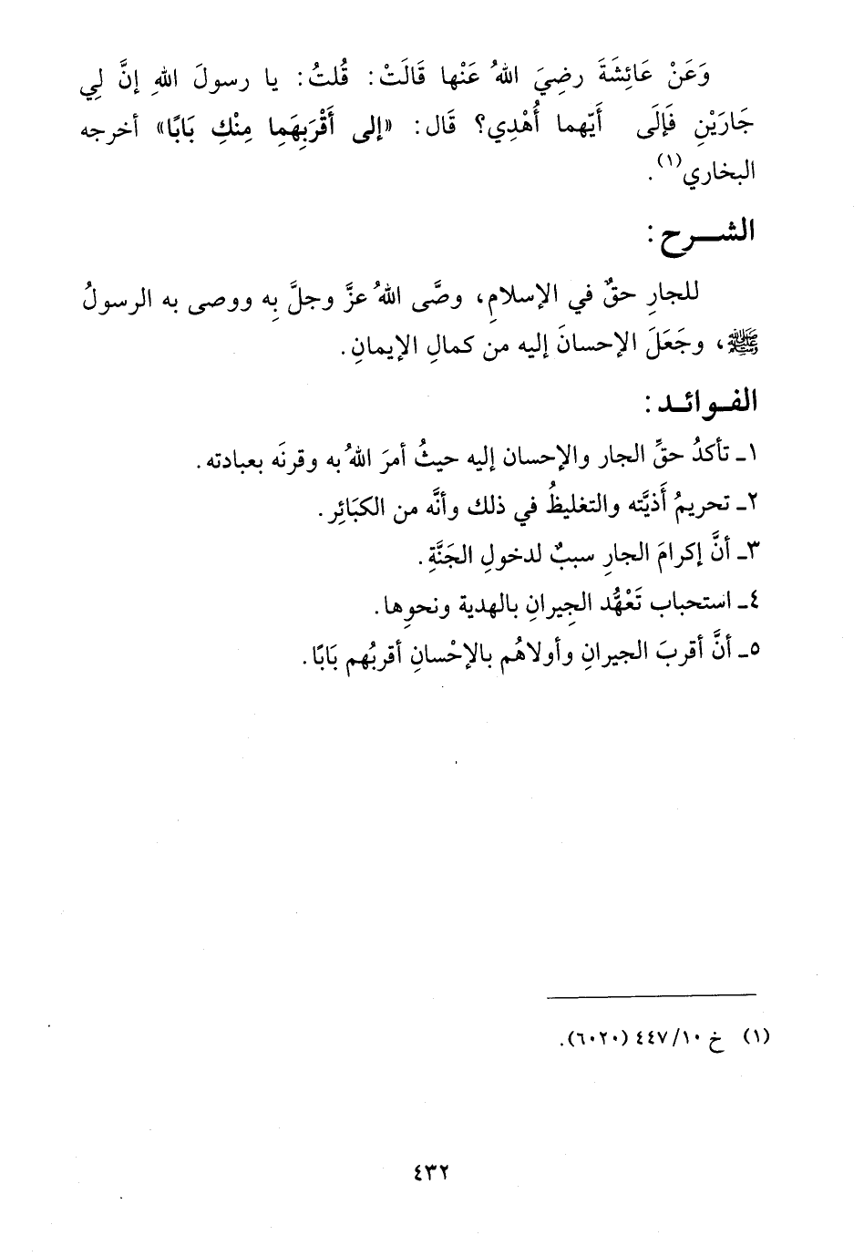 وعن عائشة رضي الله عنها قالت: قلت: يا رسول الله إن لي جارين فإلى أيهما أهدي؟ قال: "إلى أقربهما منك باباً"أخرجه البخاري (¬1).