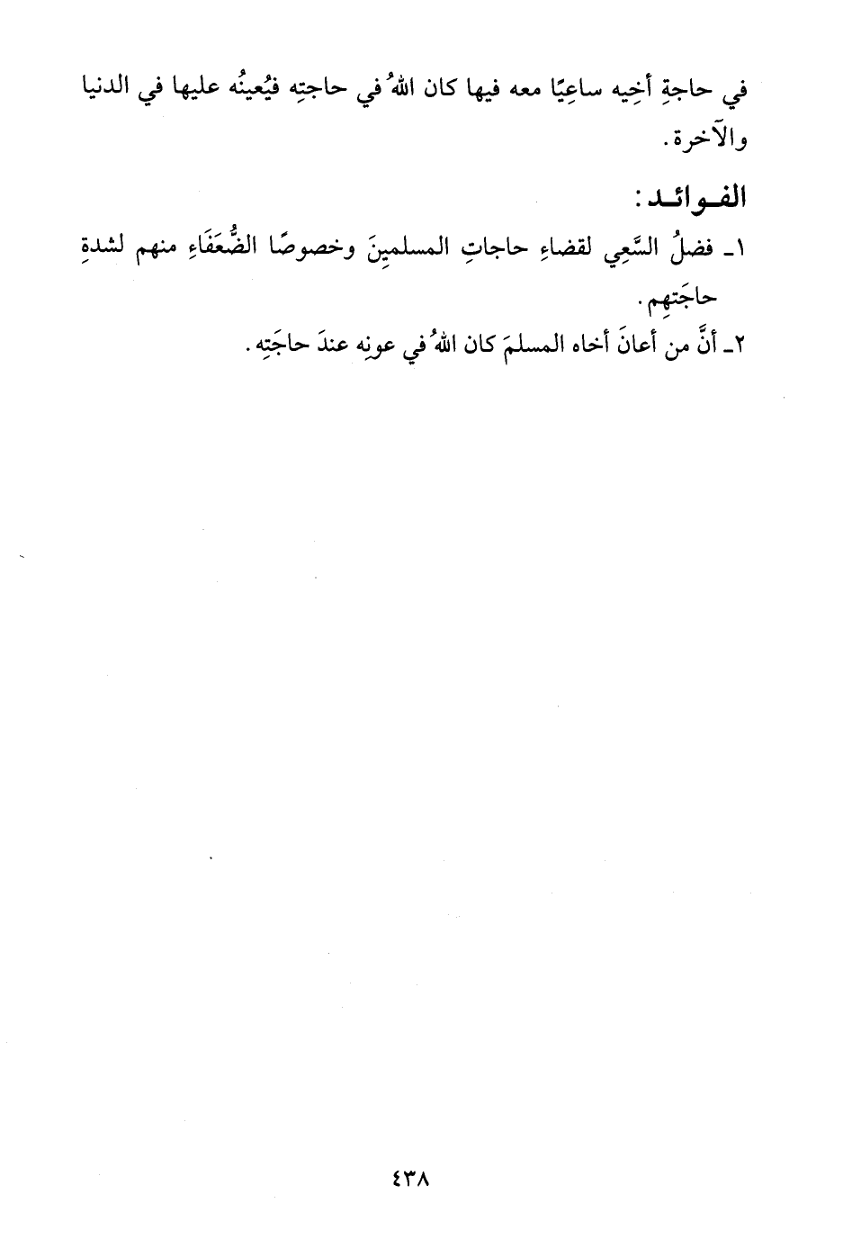 - فضل السعي لقضاء حاجات المسلمين وخصوصاً الضعفاء منه لشدة حاجتهم.