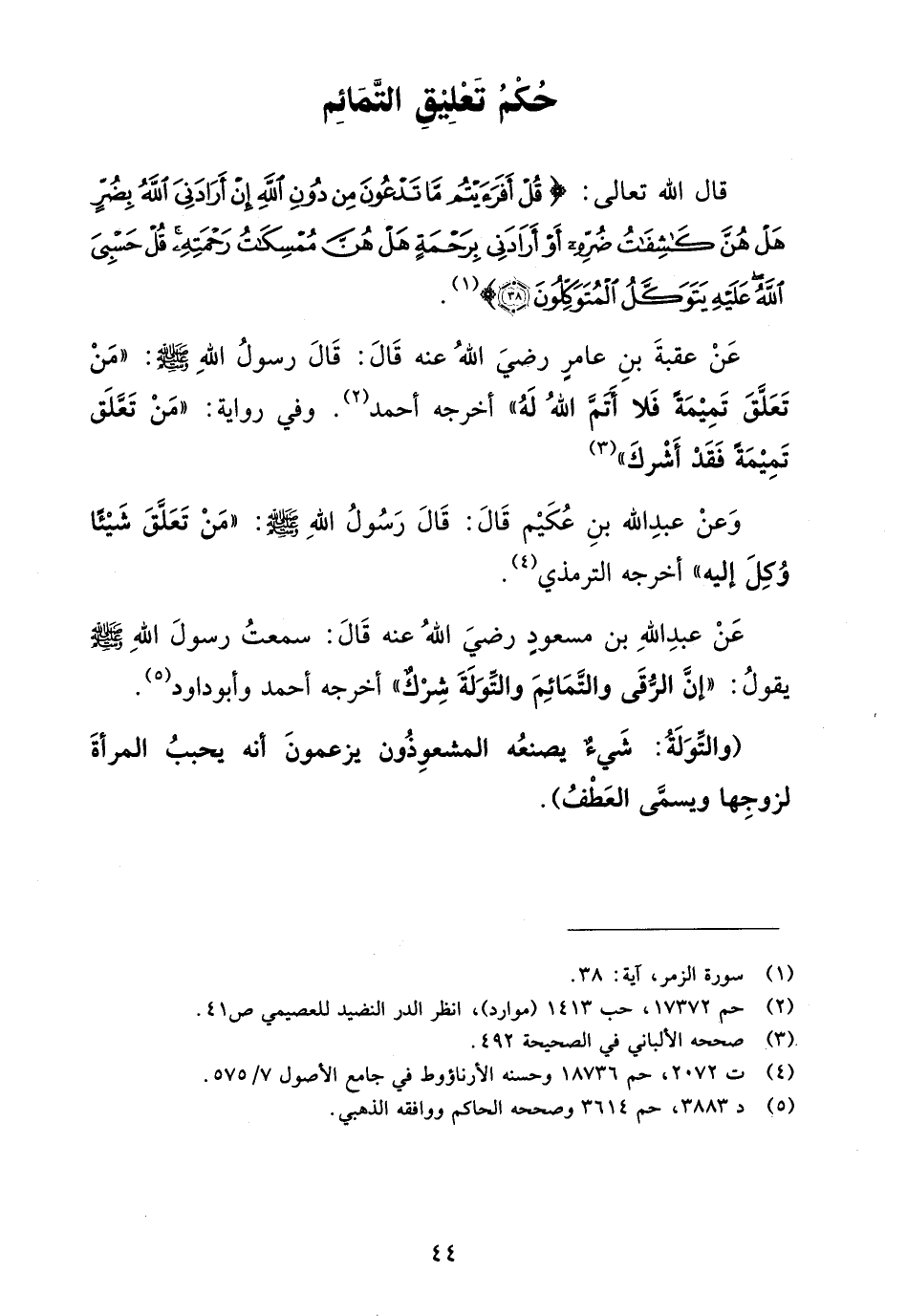 عن عقبة بن عامر رضي الله عنه قال: قال رسول الله صلى الله عليه وسلم: "من تعلق تميمة فلا أتم الله له" أخرجه أحمد (¬2). وفي رواية: "من تعلق تميمة فقد أشرك (¬3).
