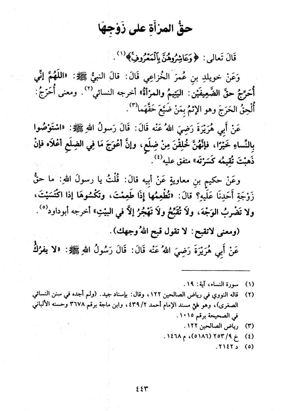 وعن حكيم بن معاوية عن أبيه قال: قلت يا رسول الله: ما حق زوجة أحدنا عليه؟ قال: "تطعمها إذا طعمت، وتكسوها إذا اكتسيت، ولا تضرب الوجه، ولا تقبح ولا تهجر إلا في البيت"أخرجه أبو داود (¬5).
