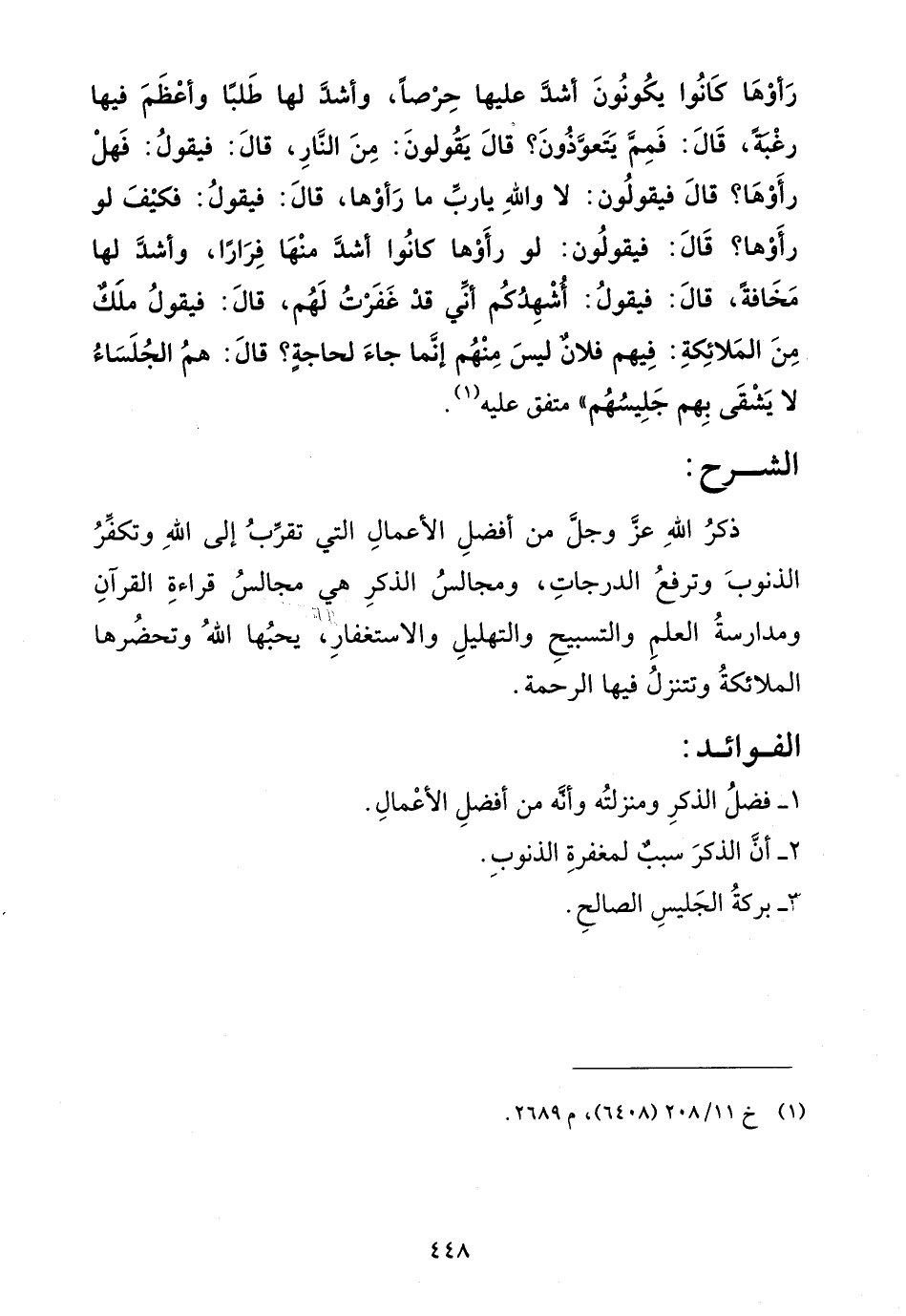 رأوها كانوا يكونوا أشد عليها حرصاً، وأشد لها طلباً وأعظم فيها رغبة، قال: فمم يتعوذون؟ قال يقولون: من النار، قال: فيقول: فهل رأوها؟ قال فيقولون: لا والله يا رب ما رأوها، قال: فيقول: فكيف لو رأوها؟ قال: فيقولون: لو رأوها كانوا أشد منها فراراً، وأشد لها مخافة، قال: فيقول: أشهدكم أني قد غفرت لهم، قال: فيقول ملك من الملائكة: فيهم فلان ليس منهم إنما جاء لحاجة؟ قال: هم الجلساء لا يشقى بهم جليسهم"متفق عليه (¬1).