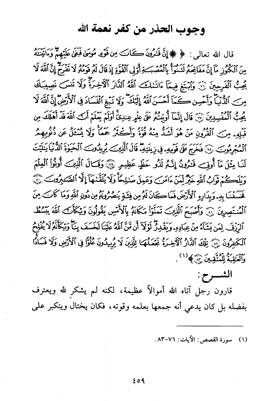 قال الله تعالى: {إِنَّ قَارُونَ كَانَ مِن قَوْمِ مُوسَى فَبَغَى عَلَيْهِمْ وَآتَيْنَاهُ مِنَ الْكُنُوزِ مَا إِنَّ مَفَاتِحَهُ لَتَنُوءُ بِالْعُصْبَةِ أُولِي الْقُوَّةِ إِذْ قَالَ لَهُ قَوْمُهُ لا تَفْرَحْ إِنَّ اللَّهَ لا يُحِبُّ الْفَرِحِينَ {} وَابْتَغِ فِيمَا آتَاكَ اللَّهُ الدَّارَ الآخِرَةَ وَلا تَنسَ نَصِيبَكَ مِنَ الدُّنْيَا وَأَحْسِن كَمَا أَحْسَنَ اللَّهُ إِلَيْكَ وَلا تَبْغِ الْفَسَادَ فِي الأَرْضِ إِنَّ اللَّهَ لا يُحِبُّ الْمُفْسِدِينَ {} قَالَ إِنَّمَا أُوتِيتُهُ عَلَى عِلْمٍ عِندِي أَوَلَمْ يَعْلَمْ أَنَّ اللَّهَ قَدْ أَهْلَكَ مِن قَبْلِهِ مِنَ القُرُونِ مَنْ هُوَ أَشَدُّ مِنْهُ قُوَّةً وَأَكْثَرُ جَمْعًا وَلا يُسْأَلُ عَن ذُنُوبِهِمُ الْمُجْرِمُونَ {} فَخَرَجَ عَلَى قَوْمِهِ فِي زِينَتِهِ قَالَ الَّذِينَ يُرِيدُونَ الْحَيَاةَ الدُّنيَا يَا لَيْتَ لَنَا مِثْلَ مَا أُوتِيَ قَارُونُ إِنَّهُ لَذُو حَظٍّ عَظِيمٍ {} وَقَالَ الَّذِينَ أُوتُوا الْعِلْمَ وَيْلَكُمْ ثَوَابُ اللَّهِ خَيْرٌ لِّمَنْ آمَنَ وَعَمِلَ صَالِحًا وَلا يُلَقَّاهَا إِلاَّ الصَّابِرُونَ {} فَخَسَفْنَا بِهِ وَبِدَارِهِ الأَرْضَ فَمَا كَانَ لَهُ مِن فِئَةٍ يَنصُرُونَهُ مِن دُونِ اللَّهِ وَمَا كَانَ مِنَ المُنتَصِرِينَ {} وَأَصْبَحَ الَّذِينَ تَمَنَّوْا مَكَانَهُ بِالأَمْسِ يَقُولُونَ وَيْكَأَنَّ اللَّهَ يَبْسُطُ الرِّزْقَ لِمَن يَشَاء مِنْ عِبَادِهِ وَيَقْدِرُ لَوْلا أَن مَّنَّ اللَّهُ عَلَيْنَا لَخَسَفَ بِنَا وَيْكَأَنَّهُ لا يُفْلِحُ الْكَافِرُونَ {} تِلْكَ الدَّارُ الآخِرَةُ نَجْعَلُهَا لِلَّذِينَ لا يُرِيدُونَ عُلُوًّا فِي الأَرْضِ وَلا فَسَادًا وَالْعَاقِبَةُ لِلْمُتَّقِينَ} (¬1).