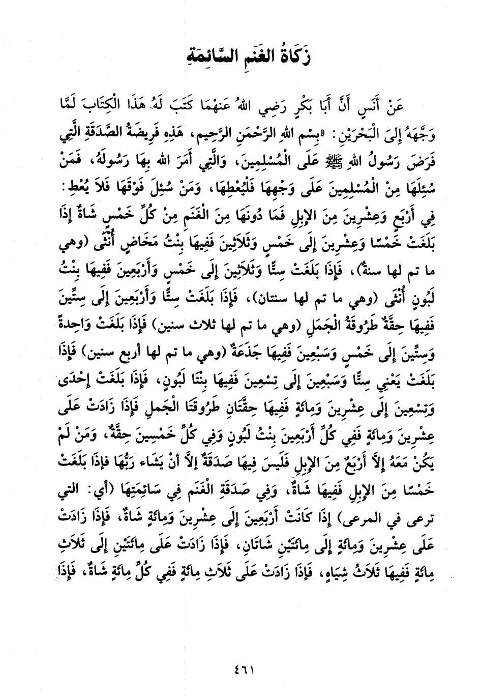 عن أنس أن أبا بكر رضي الله عنهما كتب له هذا الكتاب لما وجهه إلى البحرين: "بسم الله الرحمن الرحيم، هذه فريضة الصدقة التي فرض رسول الله صلى الله عليه وسلم على المسلمين، والتي أمر الله بها رسوله، فمن سئلها من المسلمين على وجهها فليعطها، ومن سئل فوقها فلا يعط: في أربع وعشرين من الإبل فما دونها من الغنم من كل خمس شاة إذا بلغت خمساً وعشرين إلى خمس وثلاثين ففيها بنت مخاض أنثى (وهي ما تم لها سنة)، فإذا بلغت ستاً وثلاثين إلى خمس وأربعين ففيها بنت لبون أنثى (وهي ما تم لها سنتان)، فإذا بلغت ستاً وأربعين إلى ستين ففيها حقة طروقة الجمل (وهي ما تم لها ثلاث سنين) فإذا بلغت واحدة وستين إلى خمس وسبعين ففيها جذعة (وهي ما تم لها أربع سنين) فإذا بلغت يعني ستاً وسبعين إلى تسعين ففيها بنتا لبون، فإذا بلغت إحدى وتسعين إلى عشرين ومائة ففيها حقتان طروقتا الجمل فإذا زادت على عشرين ومائة ففي كل أربعين بنت لبون وفي كل خمسين حقة، ومن لم يكن معه إلا أربع من الإبل فليس فيها صدقة إلا أن يشاء ربها فإذا بلغت خمساً من الإبل ففيها شاة، وفي صدقة الغنم في سائمتها (أي: التي ترعى في المرعى) إذا كانت أربعين إلى عشرين ومائة شاة، فإذا زادت على عشرين ومائة إلى مائتين شاتان، فإن زادت على مائتين إلى ثلاث مائة ففيها ثلاث شياه، فإذا زادت على ثلاث مائة ففي كل مائة شاة، فإذا