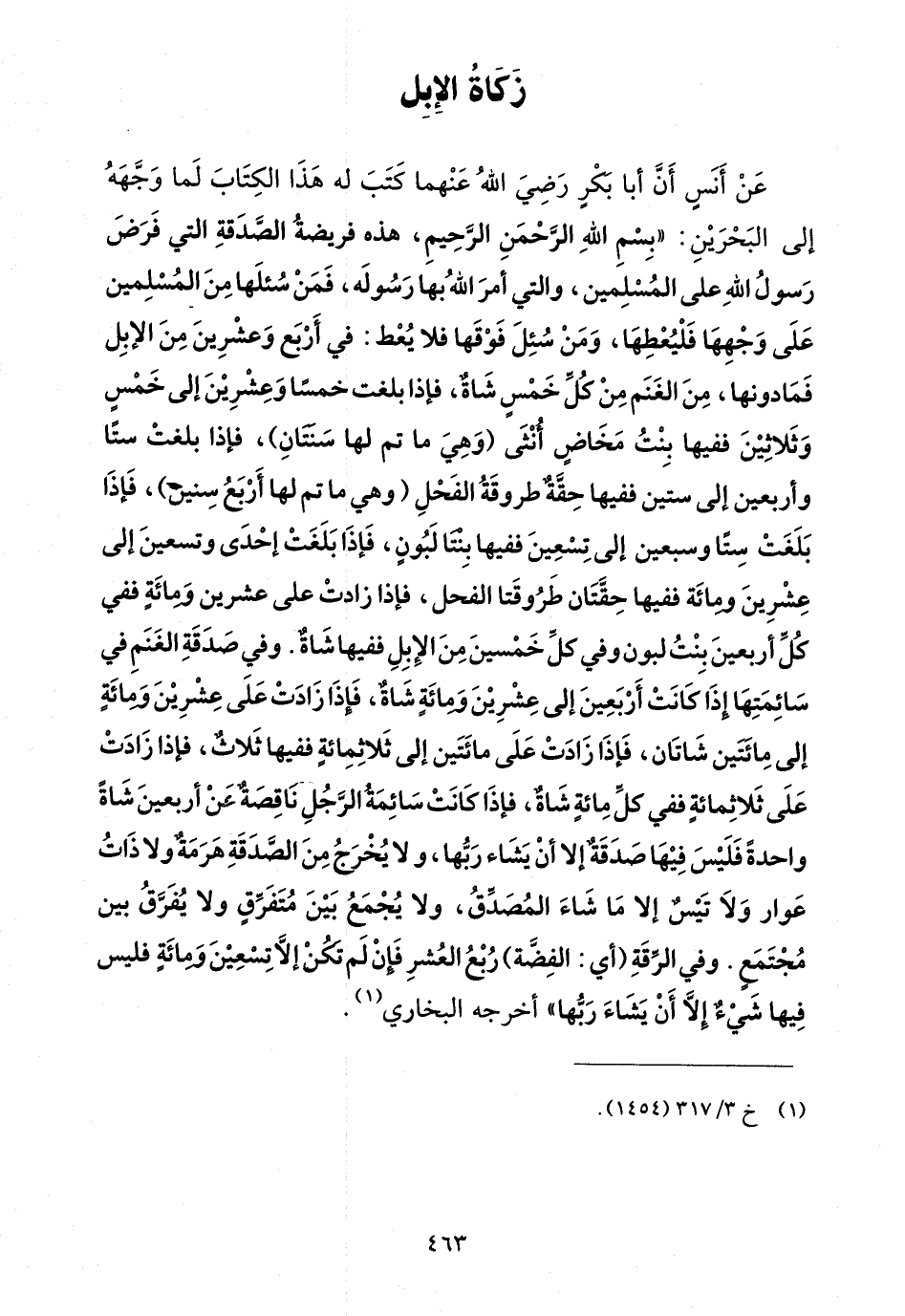 عن أنس أن أبا بكر رضي الله عنهما كتب له هذا الكتاب لما وجهه إلى البحرين: "بسم الله الرحمن الرحيم، هذه فريضة الصدقة التي فرض رسول الله على المسلمين، والتي أمر الله بها رسوله، فمن سئلها من المسلمين على وجهها فليعطها، ومن سئل فوقها فلا يعط: في أربع وعشرين من الإبل فما دونها، من الغنم من كل خمس شاة، فإذا بلغت خمساً وعشرين إلى خمس وثلاثين ففيها بنت مخاض أنثى (وهي ما تم لها سنتان)، فإذا بلغت ستاً وأربعين إلى ستين ففيها حقة طروقة الفحل (وهي ما تم لها أربع سنين)، فإذا بلغت ستاً وسبعين إلى تسعين ففيها بنتا لبون، فإذا بلغت إحدى وتسعين إلى عشرين ومائة ففيها حقتان طروقتا الفحل، فإذا زادت على عشرين ومائة ففي كل أربعين بنت لبون وفي كل خمسين من الإبل ففيها شاة. وفي صدقة الغنم في سائمتها إذا كانت أربعين إلى عشرين ومائة شاة، فإذا زادت على عشرين ومائة إلى مائتين شاتان، فإذا زادت على مائتين إلى ثلاثمائة ففيها ثلاث، فإذا زادت على ثلاثمائة ففي كل مائة شاة، فإذا كانت سائمة الرجل ناقصة عن أربعين شاة واحدة فليس فيها صدقة إلا أن يشاء ربها، ولا يخرج من الصدقة هرمة ولا ذات عوار ولا تيس إلا ما شاء المصدق، ولا يجمع بين متفرق ولا يفرق بين مجتمع. وفي الرقة (أي: الفضة) ربع العشر فإن لم يكن إلا تسعين ومائة فليس فيها شيء إلا أن يشاء ربها"أخرجه البخاري (¬1).