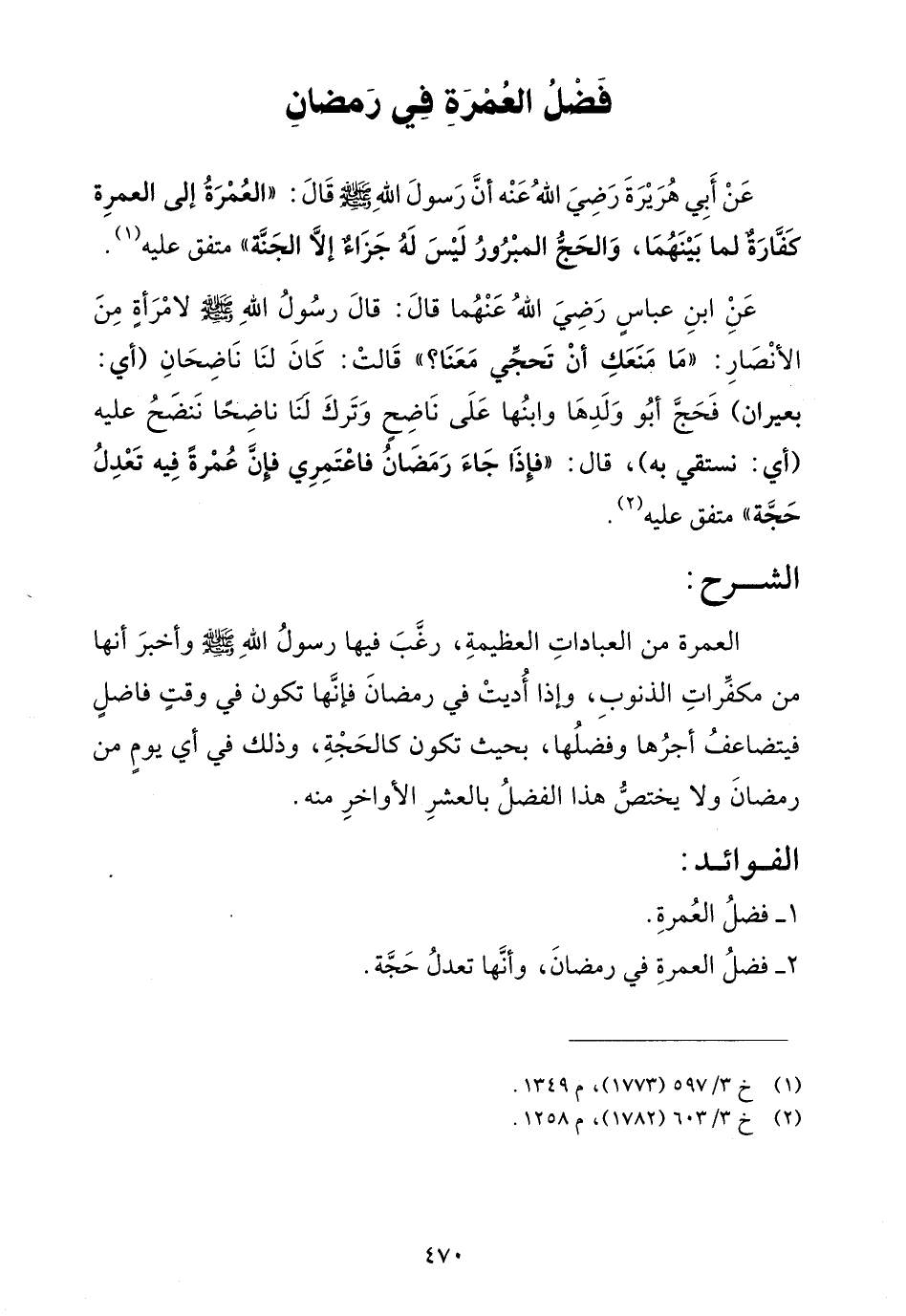 عن ابن عباس رضي الله عنهما قال: قال رسول الله صلى الله عليه وسلم لامرأة من الأنصار: "ما منعك أن تحجي معنا؟ "قالت: كان لنا ناضحان (أي: بعيران) فحج أبو ولدها وابنها على ناضح وترك لنا ناضحاً ننضح عليه (أي: نستقي به)، قال: "فإذا جاء رمضان فاعتمري فإن عمرة فيه تعدل حجة" متفق عليه (¬2).