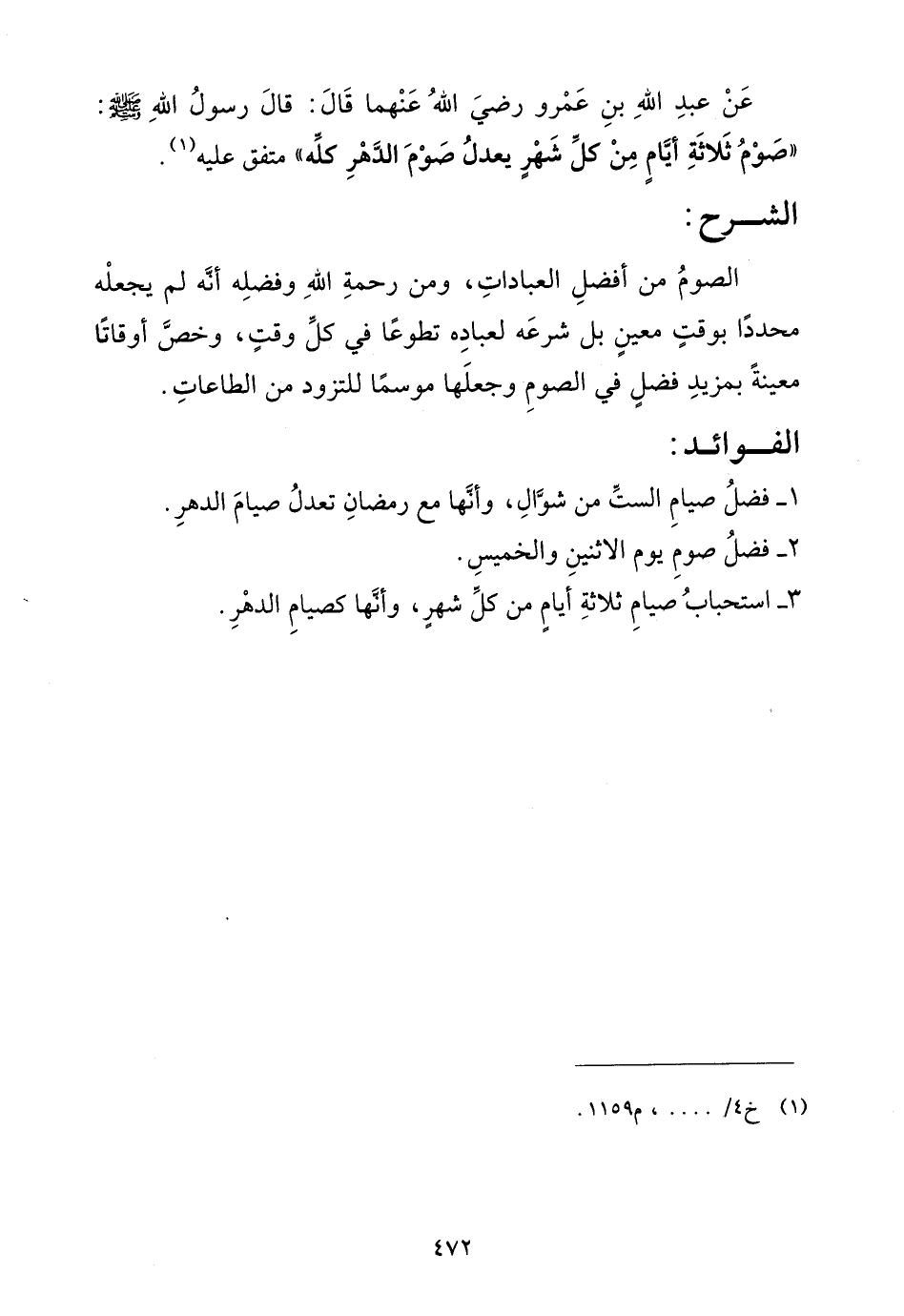عن عبد الله بن عمرو رضي الله عنهما قال: قال رسول الله صلى الله عليه وسلم: "صوم ثلاثة أيام من كل شهر يعدل صوم الدهر كله"متفق عليه (¬1).