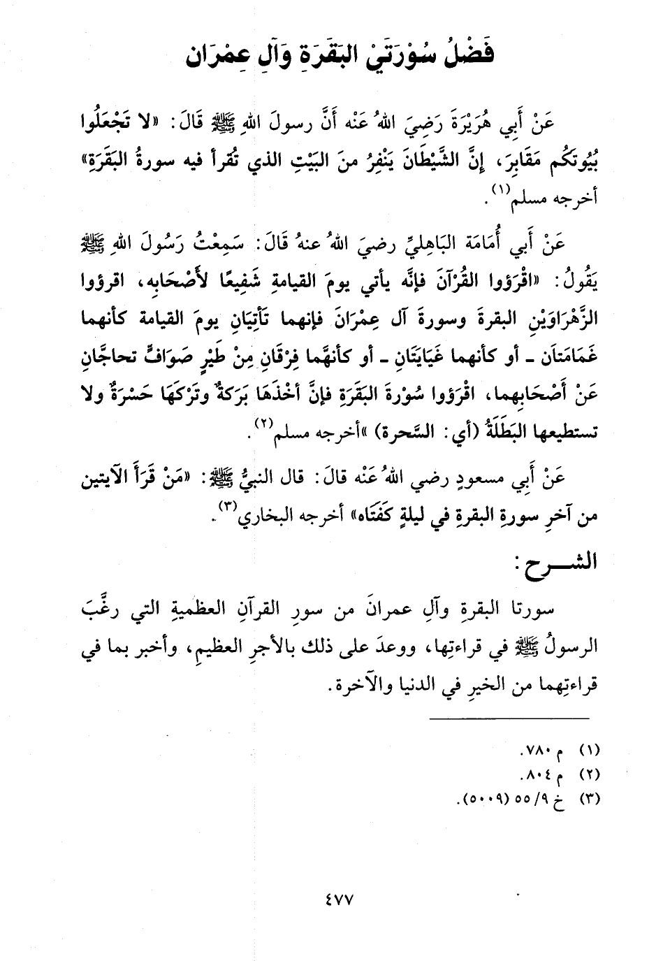 عن أبي أمامة الباهلي رضي الله عنه قال: سمعت رسول الله صلى الله عليه وسلم يقول: "اقرؤوا القرآن فإنه يأتي يوم القيامة شفيعاً لأصحابه، اقرؤوا الزهراوين البقرة وسورة آل عمران فإنهما تأتيان يوم القيامة كأنهما غمامتان - أو كأنهما غيايتان - أو كأنهما فرقان من طير صواف تحاجان عن أصحابهما، اقرؤوا سورة البقرة فإن أخذها بركة وتركها حسرة ولا تستطيعها البطلة (أي: السحرة) "أخرجه مسلم (¬2).