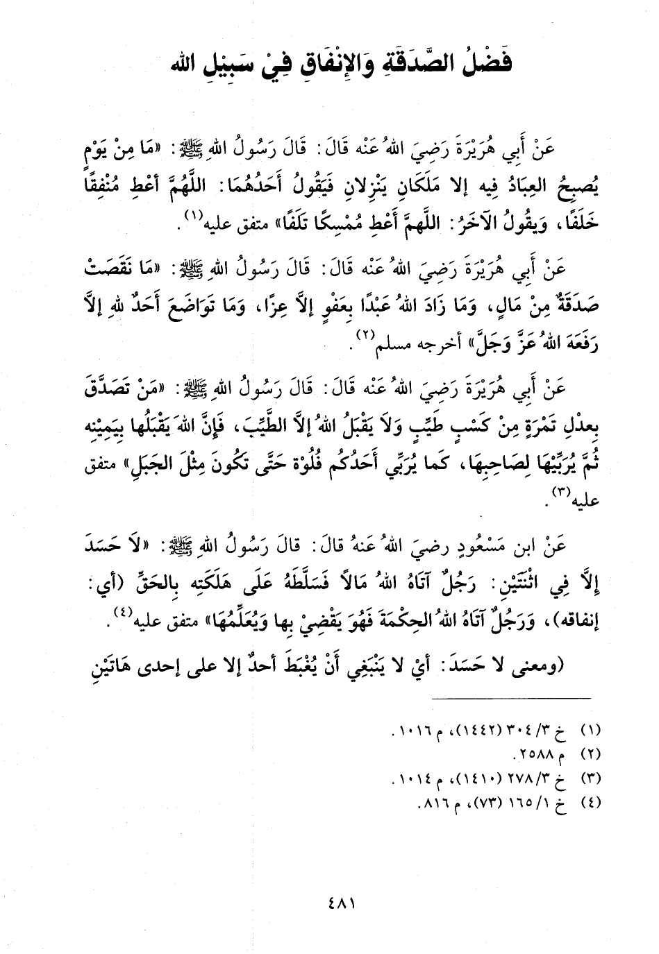 عن ابن مسعود رضي الله عنه قال: قال رسول الله صلى الله عليه وسلم: لا حسد إلا في اثنتين: رجل آتاه الله مالاً فسلطه على هلكته بالحق (أي: إنفاقه)، ورجل آتاه الله الحكمة فهو يقضي بها ويعلمها" متفق عليه (¬4).