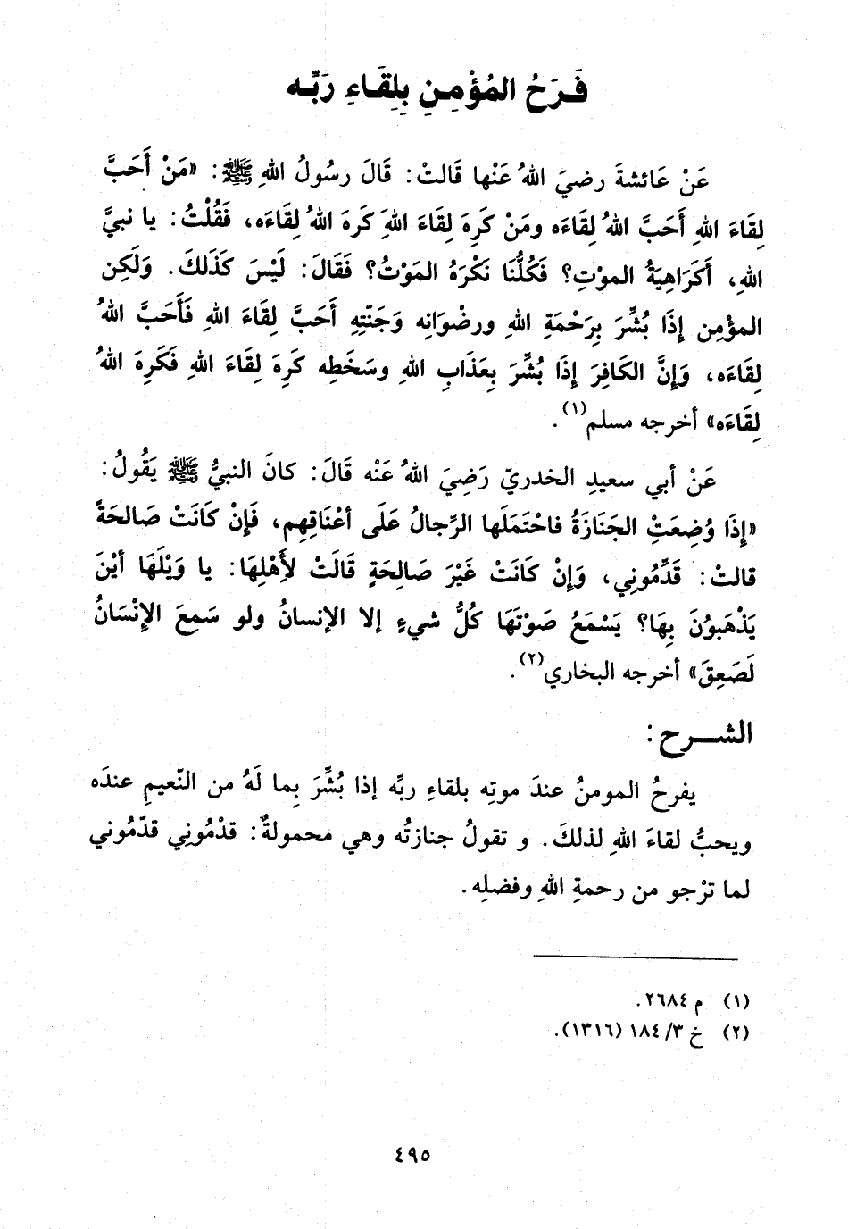 عن عائشة رضي الله عنها قالت: قال رسول الله صلى الله عليه وسلم: "من أحب لقاء الله أحب الله لقاءه ومن كره لقاء الله كره الله لقاءه، فقلت: يا نبي الله، أكراهية الموت؟ فكلنا نكره الموت؟ فقال: ليس كذلك. ولكن المؤمن إذا بشر برحمة الله ورضوانه وجنته أحب لقاء الله فأحب الله لقاءه، وإن الكافر إذا بشر بعذاب الله وسخطه كره لقاء الله فكره الله لقاءه"أخرجه مسلم (¬1).