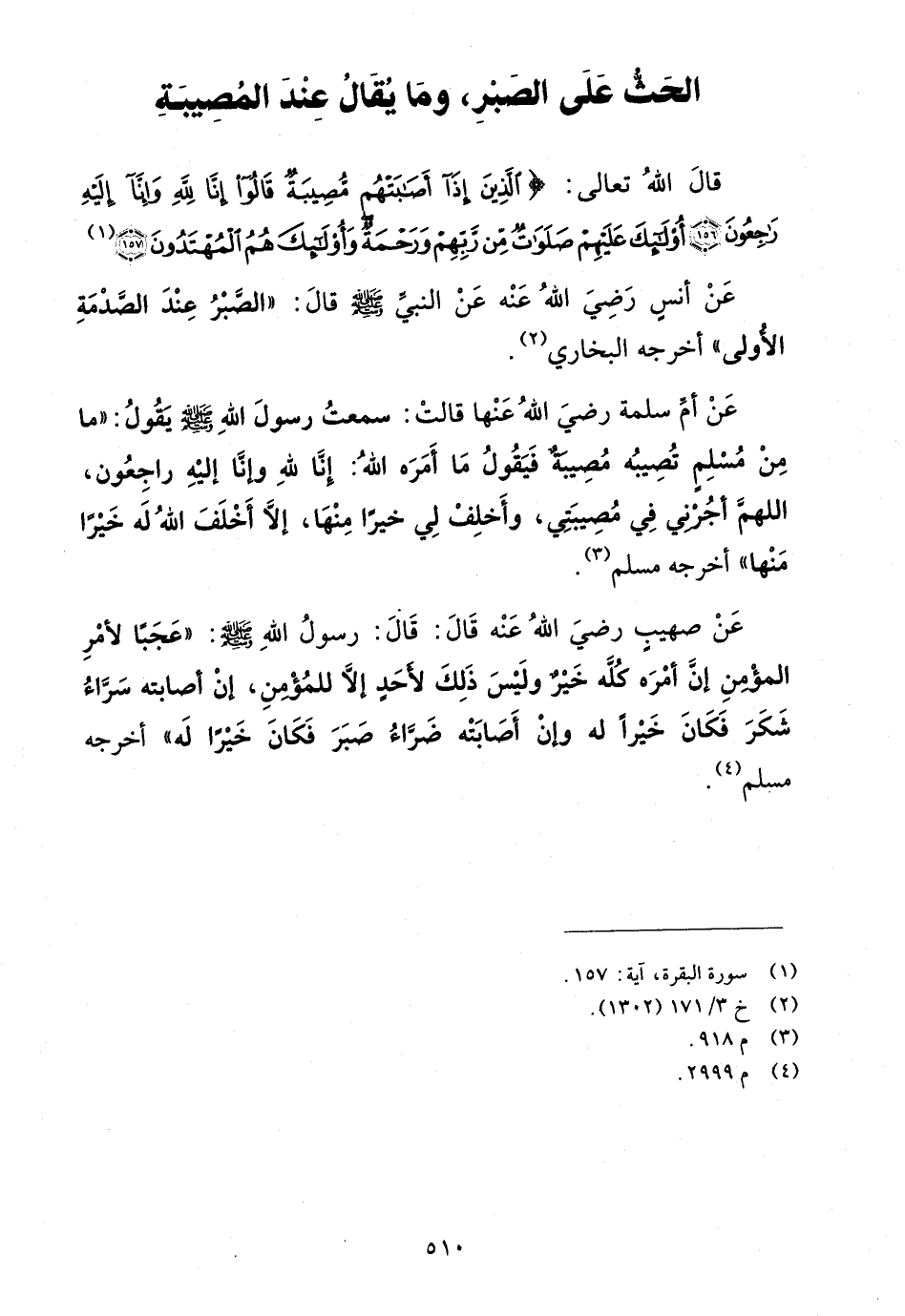 قال الله تعالى: {الَّذِينَ إِذَا أَصَابَتْهُم مُّصِيبَةٌ قَالُوا إِنَّا لِلّهِ وَإِنَّا إِلَيْهِ رَاجِعونَ {} أُولَئِكَ عَلَيْهِمْ صَلَوَاتٌ مِّن رَّبِّهِمْ وَرَحْمَةٌ وَأُولَئِكَ هُمُ الْمُهْتَدُونَ} (¬1).