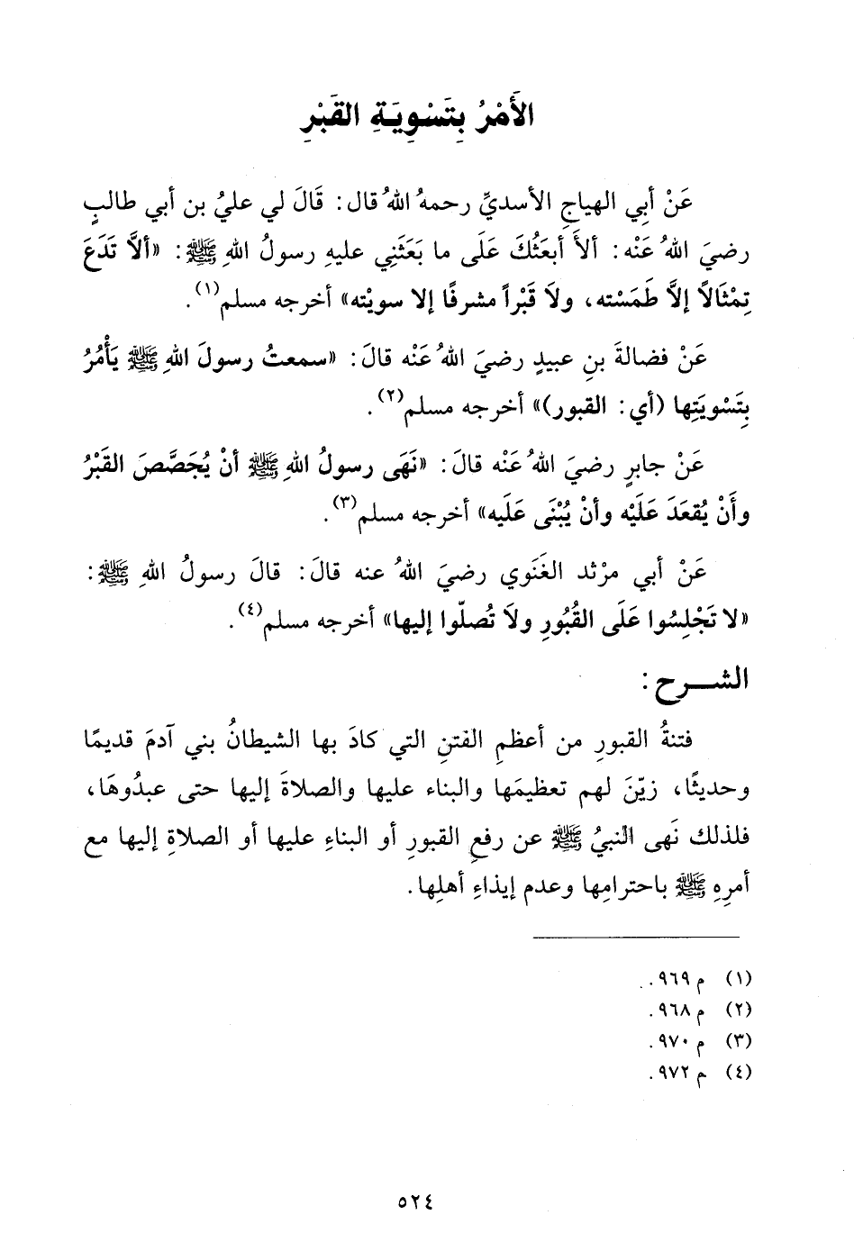 عن فضالة بن عبيد رضي الله عنه قال: "سمعت رسول الله صلى الله عليه وسلم يأمر بتسويتها (أي: القبور) "أخرجه مسلم (¬2).