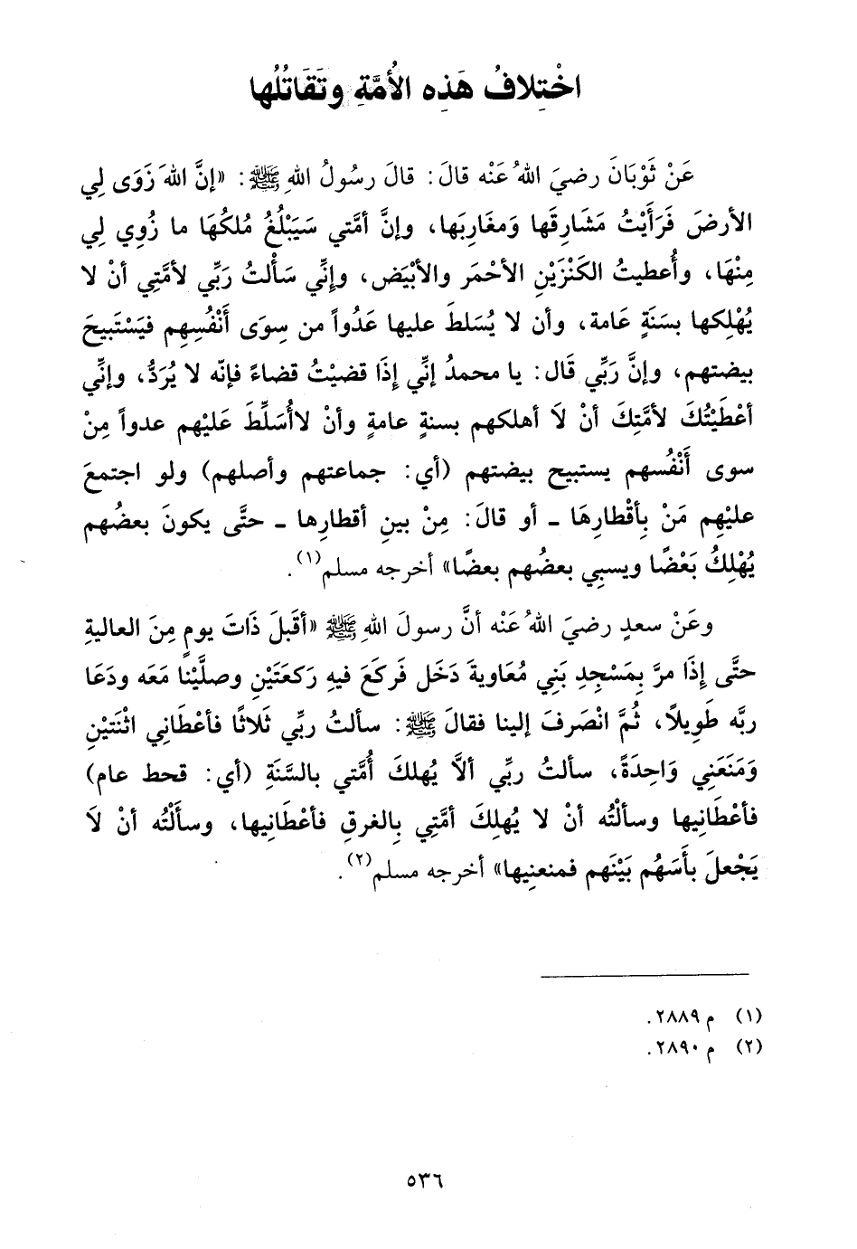 وعن سعد رضي الله عنه أن رسول الله صلى الله عليه وسلم "أقبل ذات يوم من العالية حتى إذا مر بمسجد بني معاوية دخل فركع فيه ركعتين وصلينا معه ودعا ربه طويلاً، ثم انصرف إلينا فقال صلى الله عليه وسلم: سألت ربي ثلاثاً فأعطاني اثنتين ومنعني واحدة، سألت ربي ألا يهلك أمتي بالسنة (أي: قحط عام) فأعطانيها وسألته أن لا يهلك أمتي بالغرق فأعطانيها، وسألته أن لا يجعل بأسهم بينهم فمنعنيها"أخرجه مسلم (¬2).