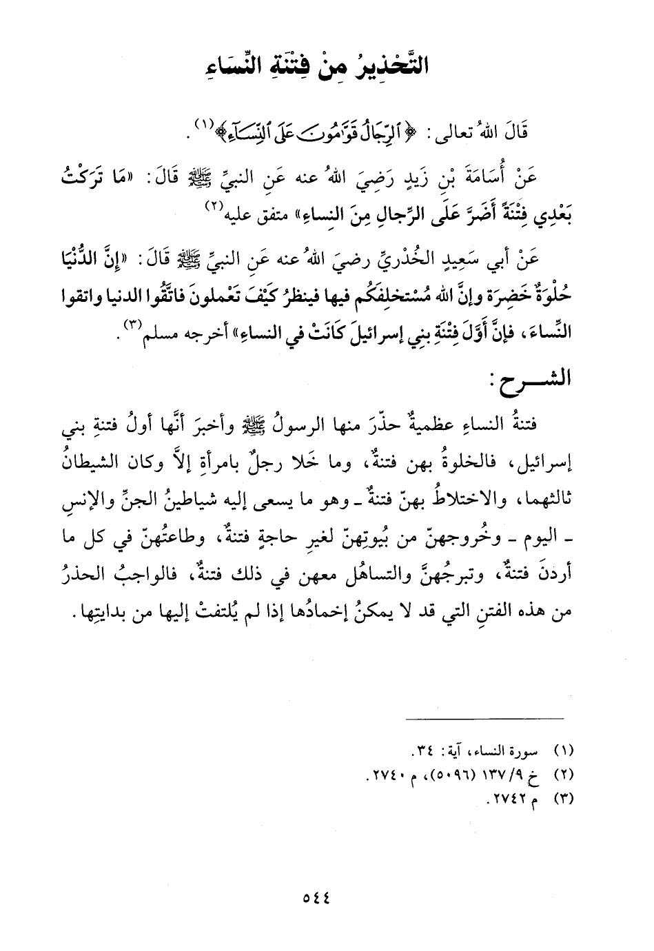 عن أسامة بن زيد رضي الله عنه عن النبي صلى الله عليه وسلم قال: "ما تركت بعدي فتنة أضر على الرجال من النساء "متفق عليه (¬2).
