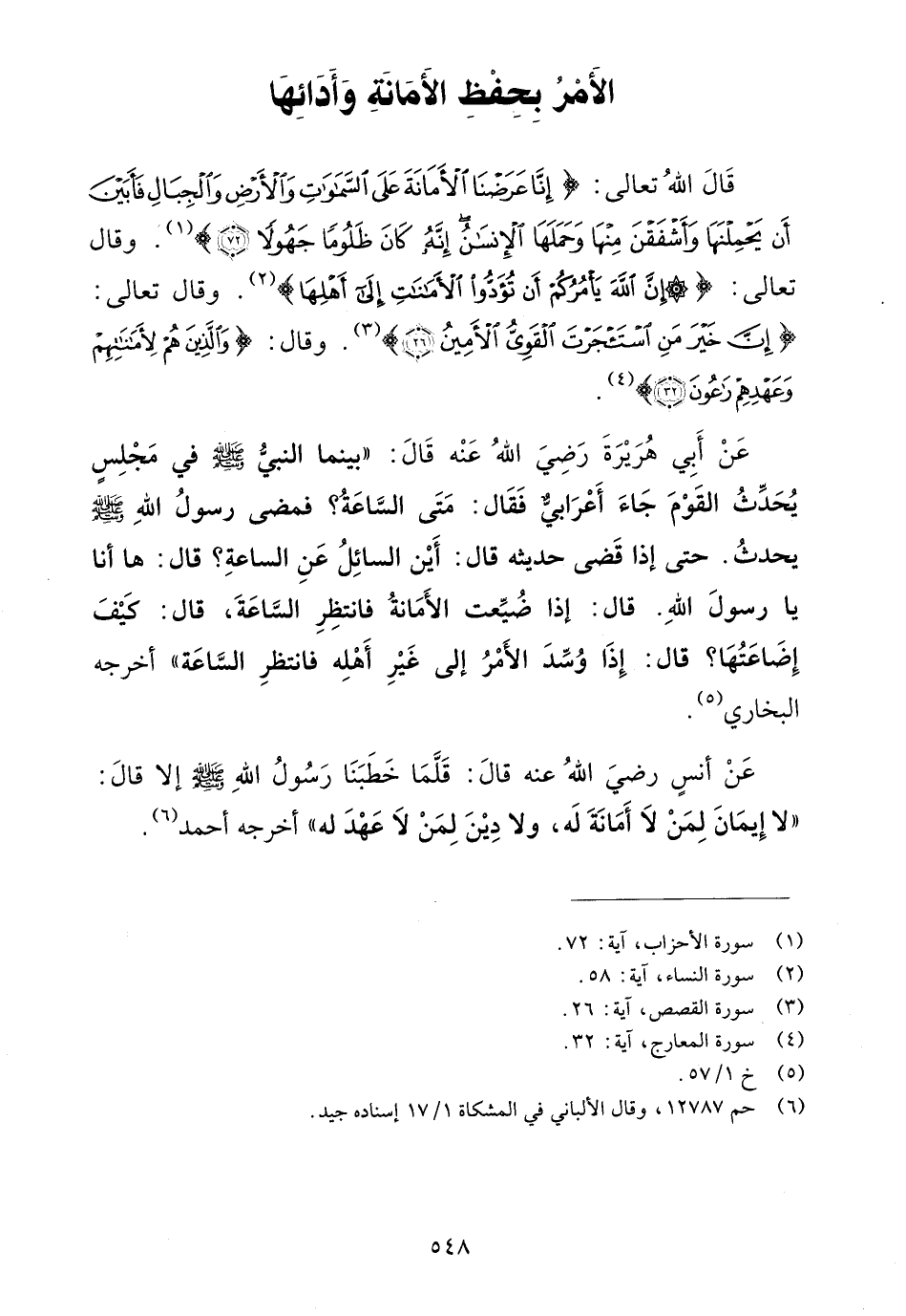 قال الله تعالى: {إِنَّا عَرَضْنَا الأَمَانَةَ عَلَى السَّمَاوَاتِ وَالأَرْضِ وَالْجِبَالِ فَأَبَيْنَ أَن يَحْمِلْنَهَا وَأَشْفَقْنَ مِنْهَا وَحَمَلَهَا الإِنسَانُ إِنَّهُ كَانَ ظَلُومًا جَهُولاً} (¬1). وقال تعالى: {إِنَّ اللهَ يَامُرُكُمْ أَن تُؤدُّوا الأَمَانَاتِ إِلَى أَهْلِهَا} (¬2). وقال تعالى: {إِنَّ خَيْرَ مَنِ اسْتَاجَرْتَ الْقَوِيُّ الأَمِينُ} (¬3). وقال {وَالَّذِينَ هُمْ لأَمَانَاتِهِمْ وَعَهْدِهِمْ رَاعُونَ} (¬4).