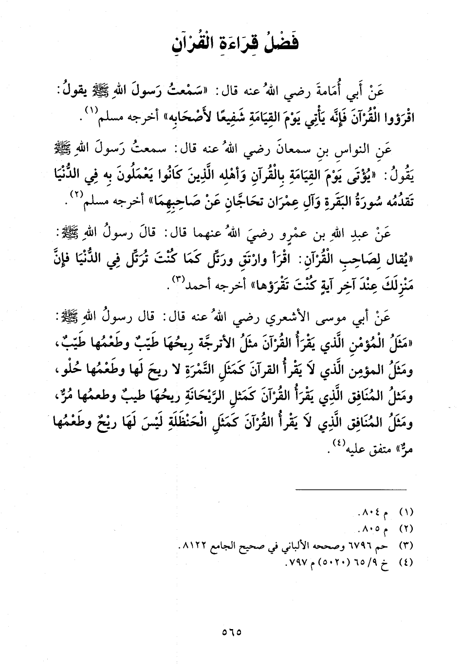 عن أبي موسى الأشعري رضي الله عنه قال: قال رسول الله صلى الله عليه وسلم: "مثل المؤمن الذي يقرأ القرآن مثل الأترجة ريحها طيب وطعمها طيب، ومثل المؤمن الذي لا يقرأ القرآن كمثل التمرة لا ريح لها وطعمها حلو، ومثل المنافق الذي يقرأ القرآن كمثل الريحانة ريحها طيب وطعمها مر، ومثل المنافق الذي لا يقرأ القرآن كمثل الحنظلة ليس لها ريح وطعمها مر" متفق عليه (¬4).