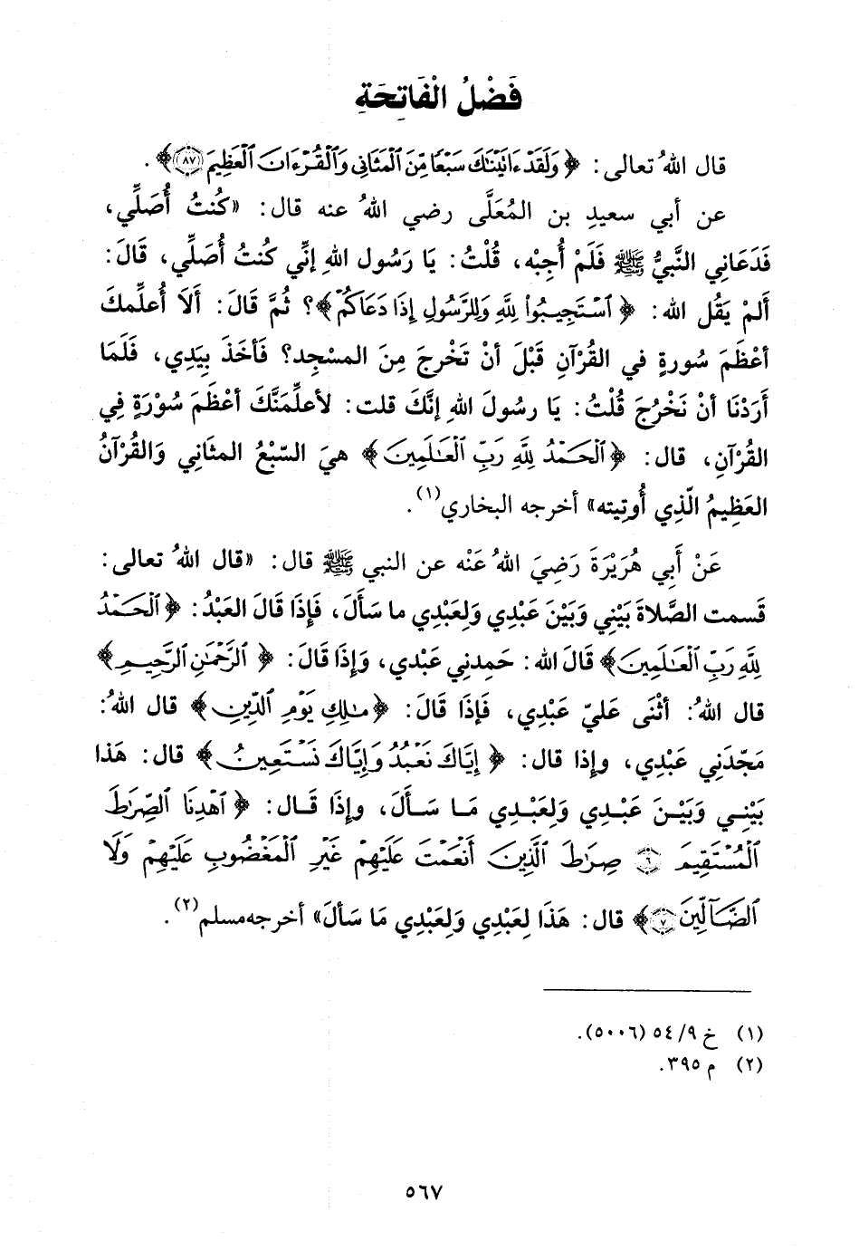 عن أبي هريرة رضي الله عنه عن النبي صلى الله عليه وسلم قال: قال الله تعالى: قسمت الصلاة بيني وبين عبدي ولعبدي ما سأل، فإذا قال العبد: {الْحَمْدُ للهِ رَبِّ الْعَالَمِينَ} قال الله: حمدني عبدي، وإذا قال: {الرَّحْمنِ الرَّحِيمِ} قال الله: أثنى علي عبدي، فإذا قال: {مَلِكِ يَوْمِ الدِّينِ} قال الله: مجدني عبدي، وإذا قال: {إِيَّاكَ نَعْبُدُ وإِيَّاكَ نَسْتَعِينُ} قال: هذا بيني وبين عبدي ولعبدي ما سأل، وإذا قال: {اهدِنَا الصِّرَاطَ المُستَقِيمَ {} صِرَاطَ الَّذِينَ أَنعَمتَ عَلَيهِمْ غَيرِ المَغضُوبِ عَلَيهِمْ وَلاَ الضَّالِّينَ} قال: هذا لعبدي ولعبدي ما سأل"أخرجه مسلم (¬2).