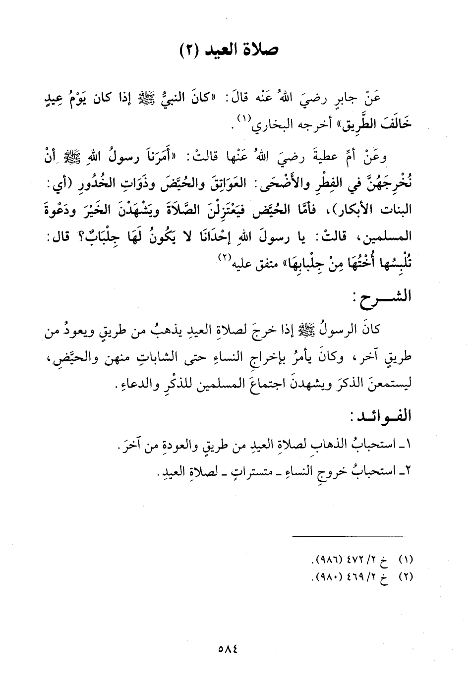 وعن أم عطية رضي الله عنها قالت: "أمرنا رسول الله صلى الله عليه وسلم أن نخرجهن في الفطر والأضحى: العواتق والحيض وذوات الخدور (أي: البنات الأبكار)، فأما الحيض فيعتزلن الصلاة ويشهدن الخير ودعوة المسلمين، قالت: يا رسول الله إحدانا لا يكون لها جلباب؟ قال: تلبسها أختها من جلبابها"متفق عليه (¬2).
